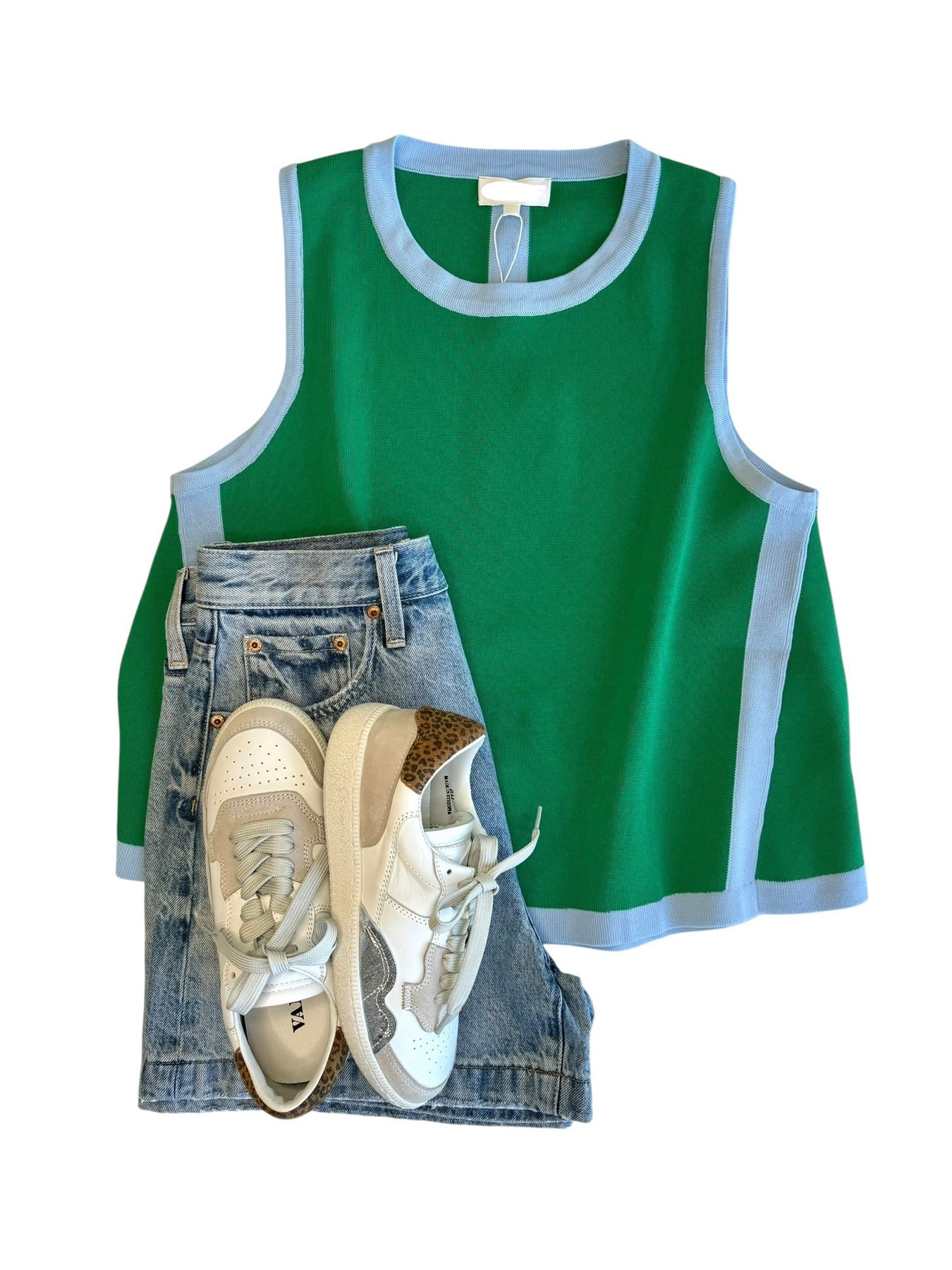 Sleevess knit tanp top with contrasting color hem. Also, available in-store.