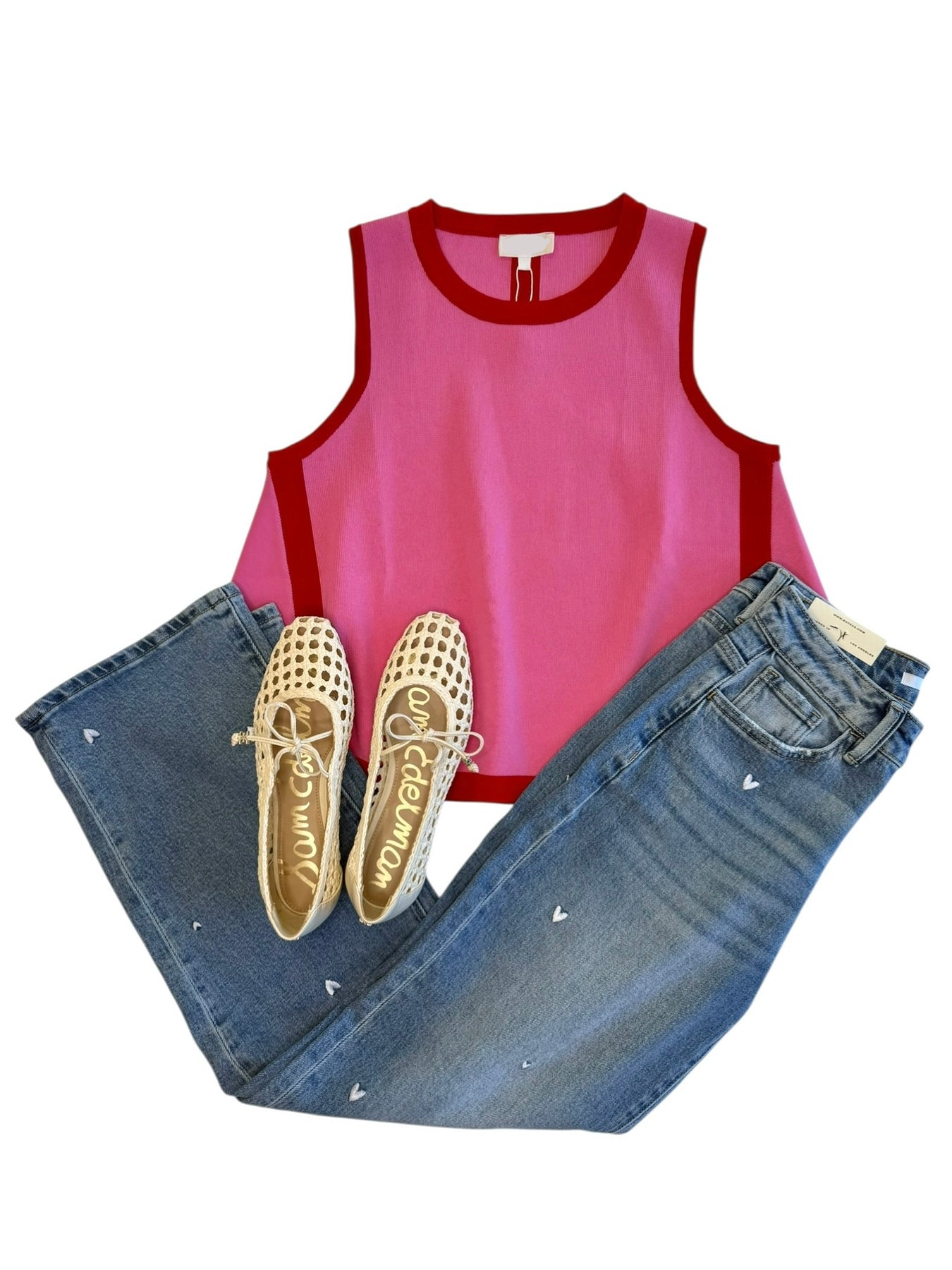 Sleevess knit tanp top with contrasting color hem. Also, available in-store.