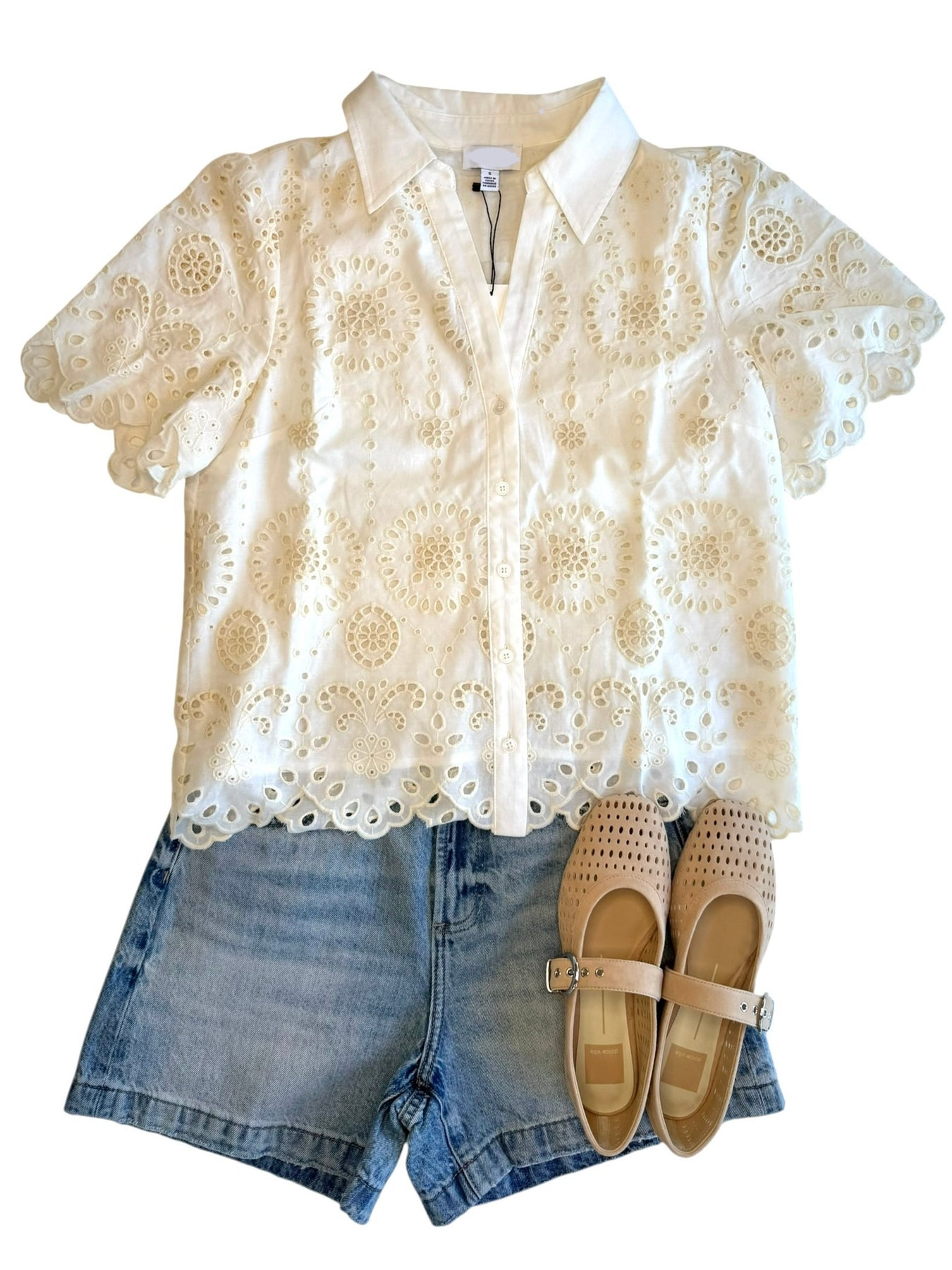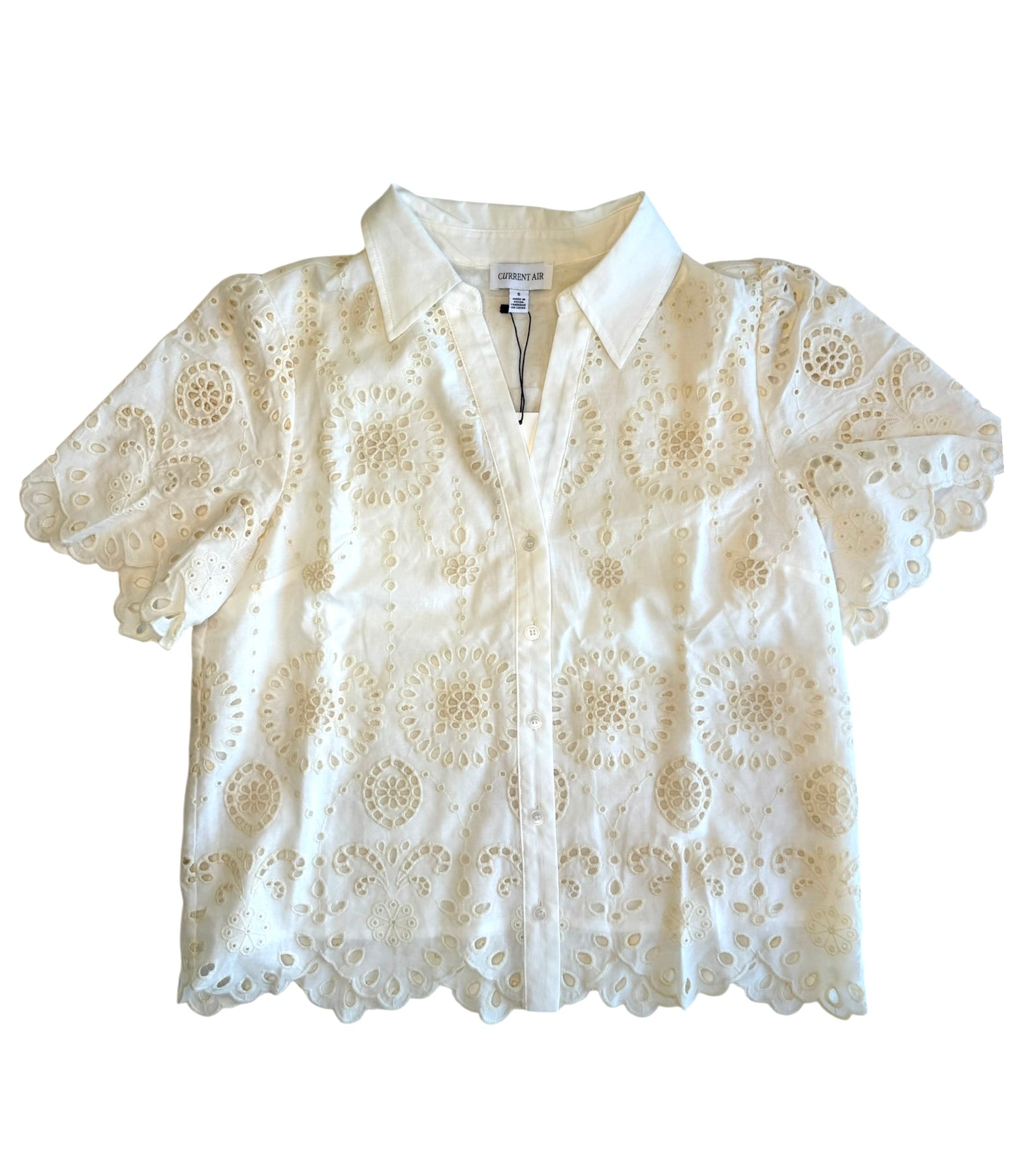 Button down, eyelet embroidered cotton top with short scalloped edge sleeves and a scalloped hem.