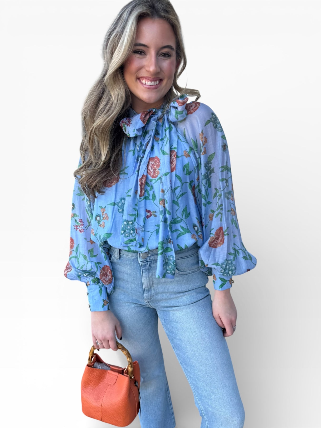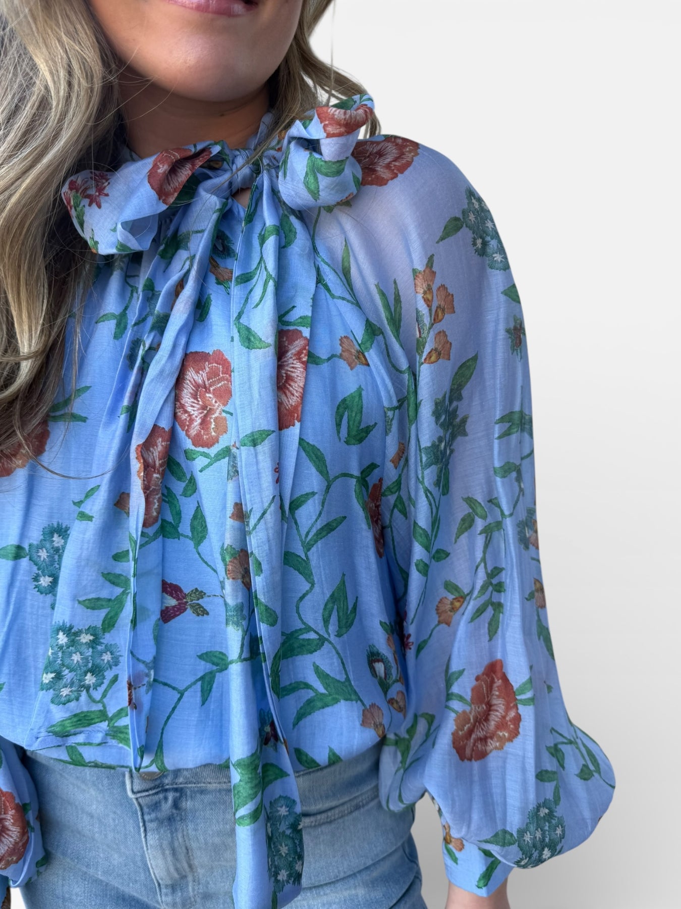 Floral print long sleeve top featuring self-tie detail at neck. Button closure at cuffs