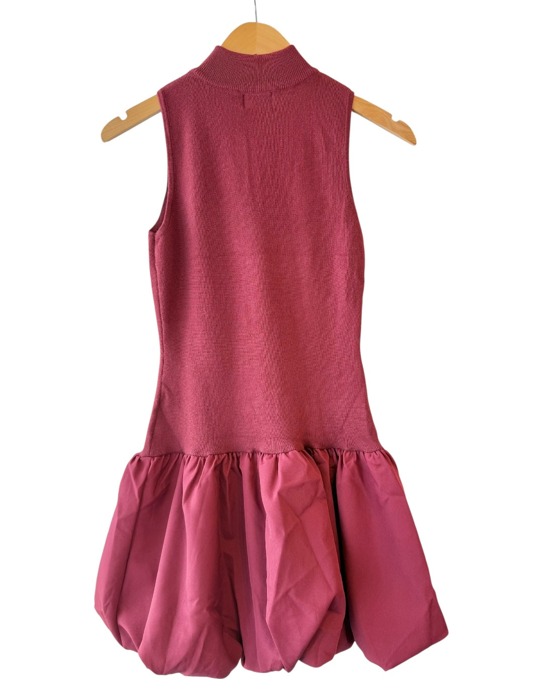 Burgundy, sleeveless knit high neck bubbled dress. Made of 53% rayon, 32% polyester and 13% nylon. Fitting true to size. Also available in store!
