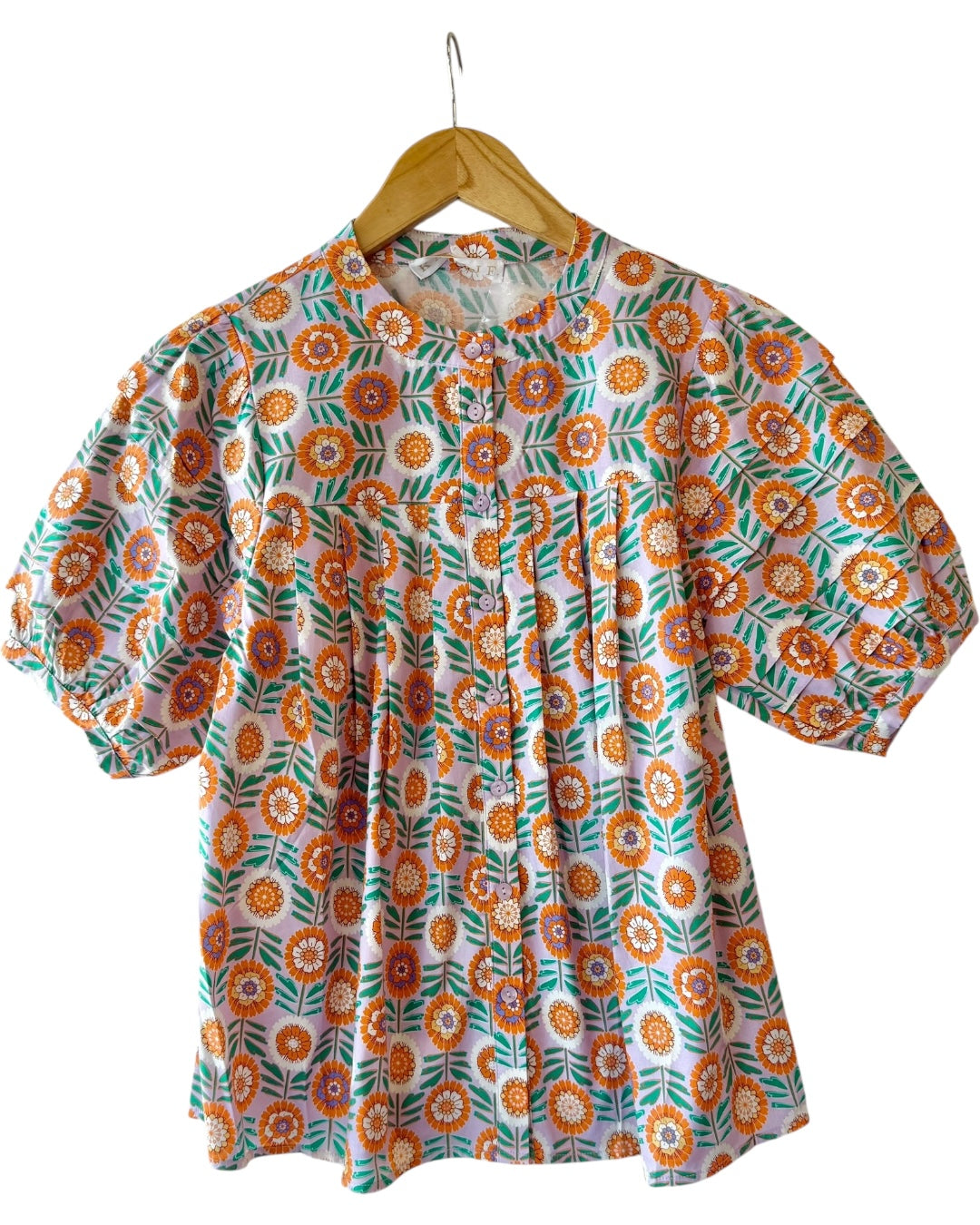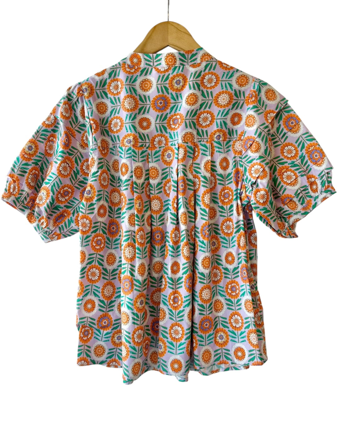 Lilac, green and orange floral print puff sleeve button down blouse. Made of 97% cotton and 3% spandex. Fitting pretty true to size. If in between, we recommend sizing down. Also available in store!