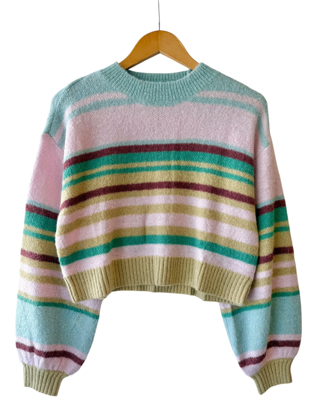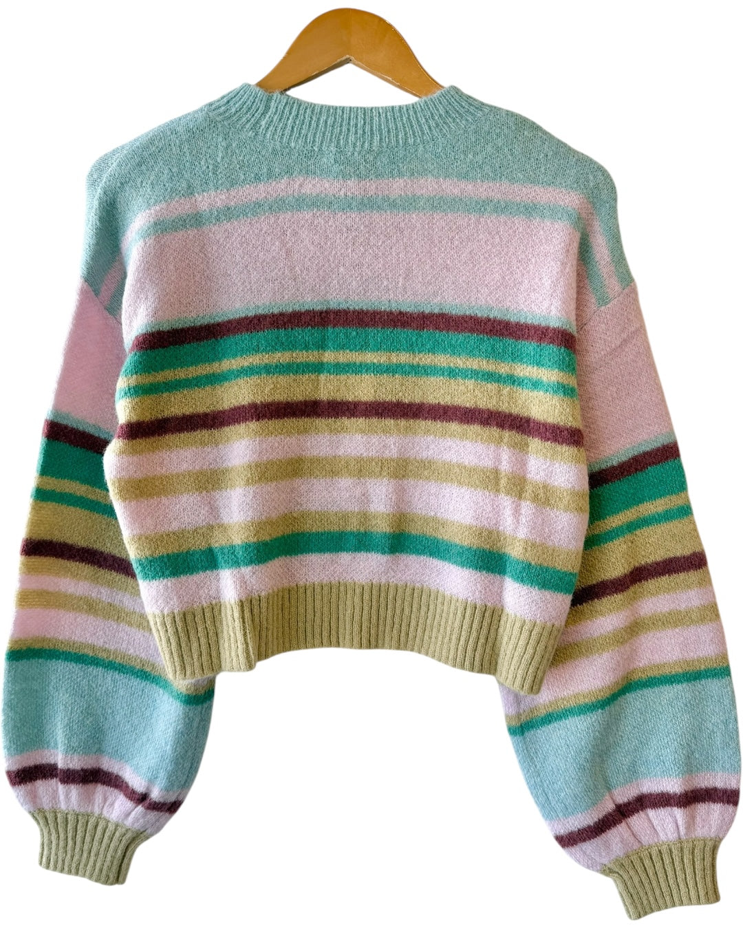 Long sleeve, striped fuzzy knit crewneck sweater. Stripes are mint, pink, tan and burgundy. Made of 50% nylon, 20% wool, 15% acrylic, and 15% polyester. Also available in store!