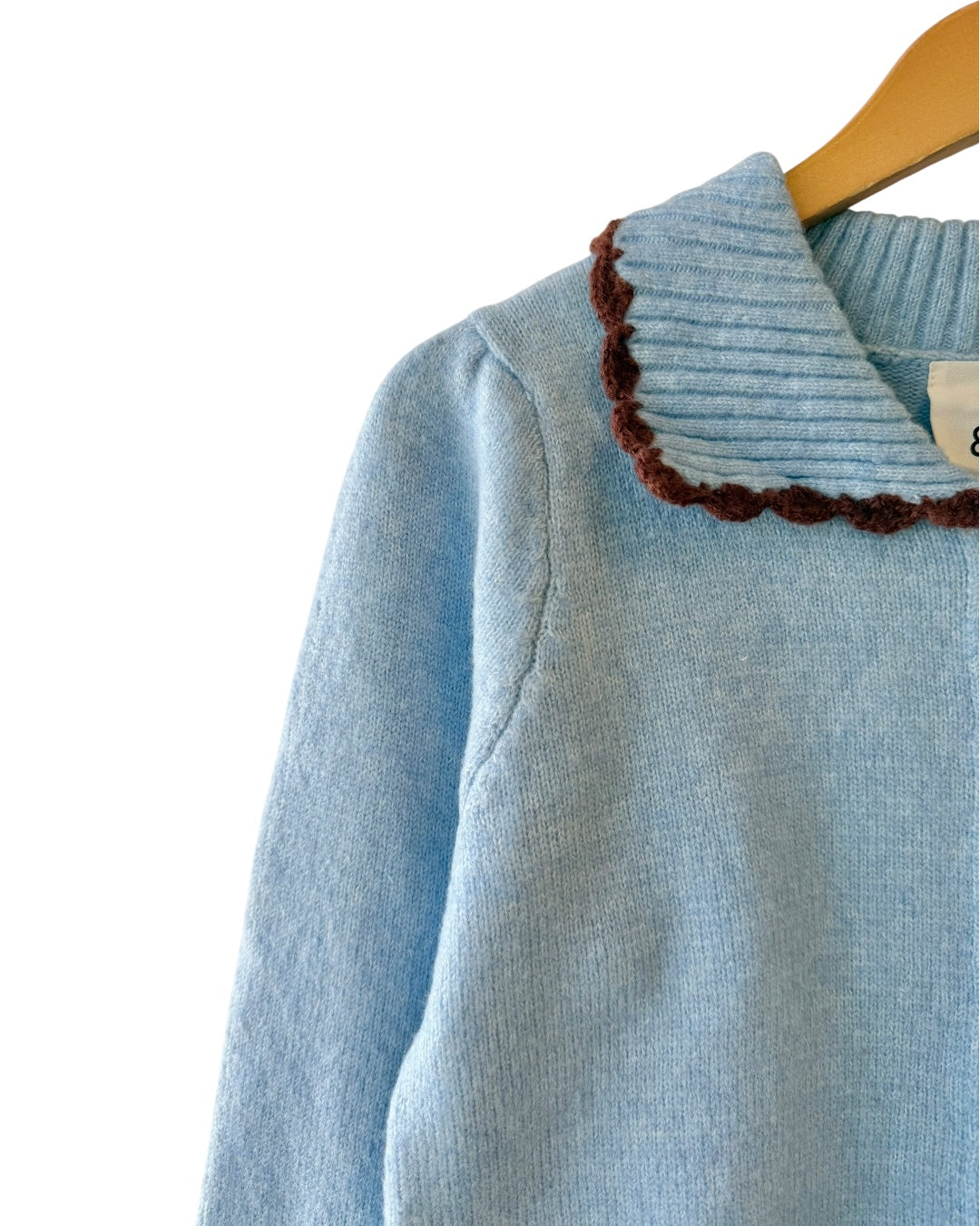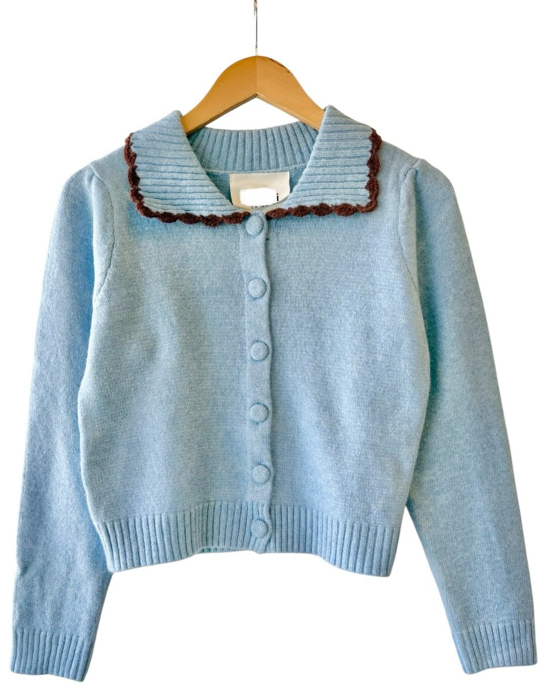 Light blue, long sleeve button down knit top with a chocolate brown scalloped trim. Fitting pretty true to size, slightly cropped style. Made of 65% polyester, 30% acrylic and 5% wool. Also available in store!