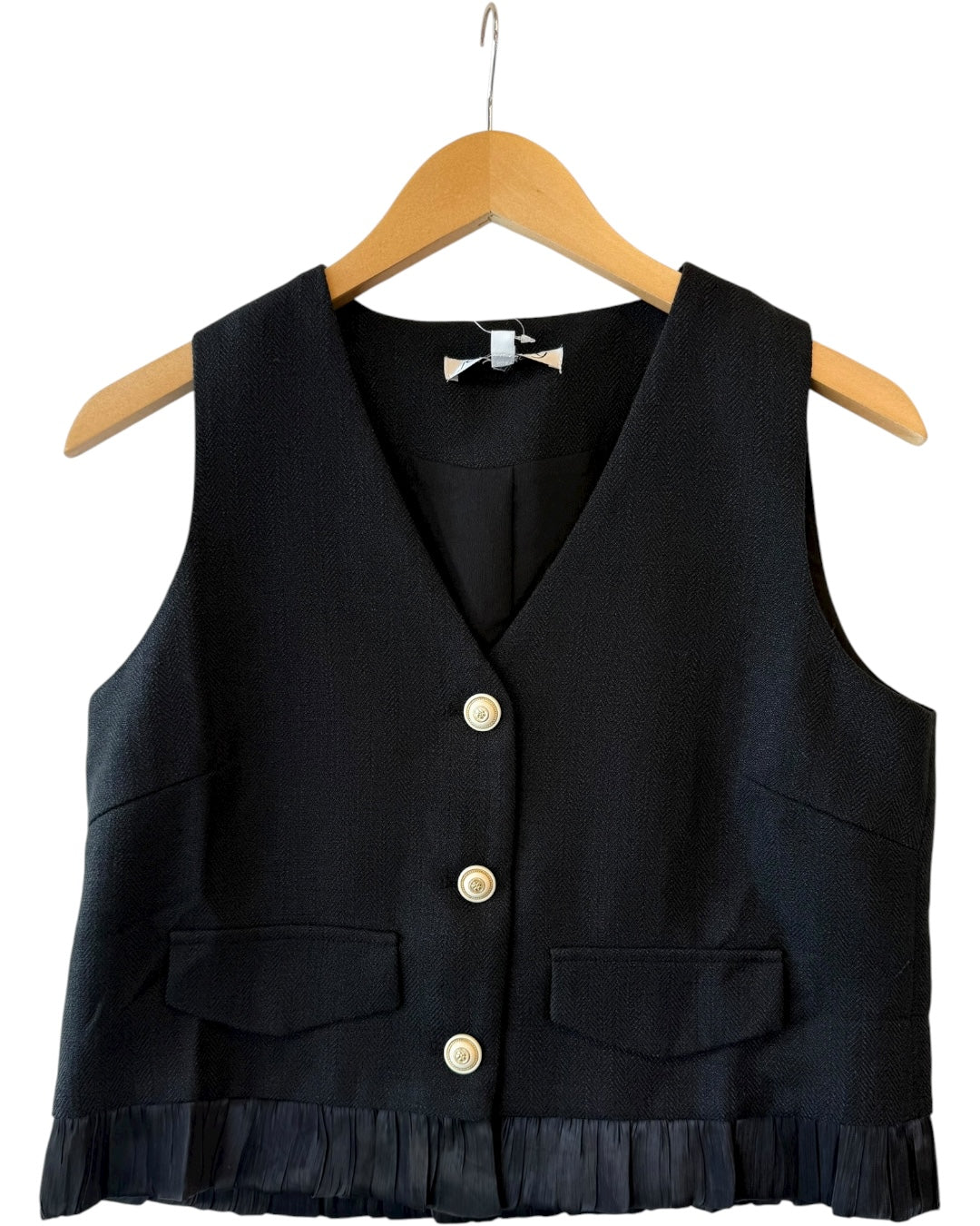 Knit, sleeveless, vneck top. Features cream/gold buttons down the front. Shiny bubbled ruffle hem at the bottom. 80% acrylic, 20% polyester, and lining is 100% cotton. Pairs well with the Puckett Shorts. Fitting true to size, also available in store!