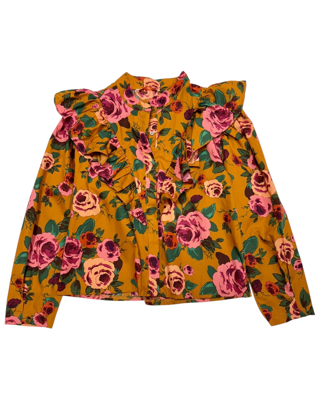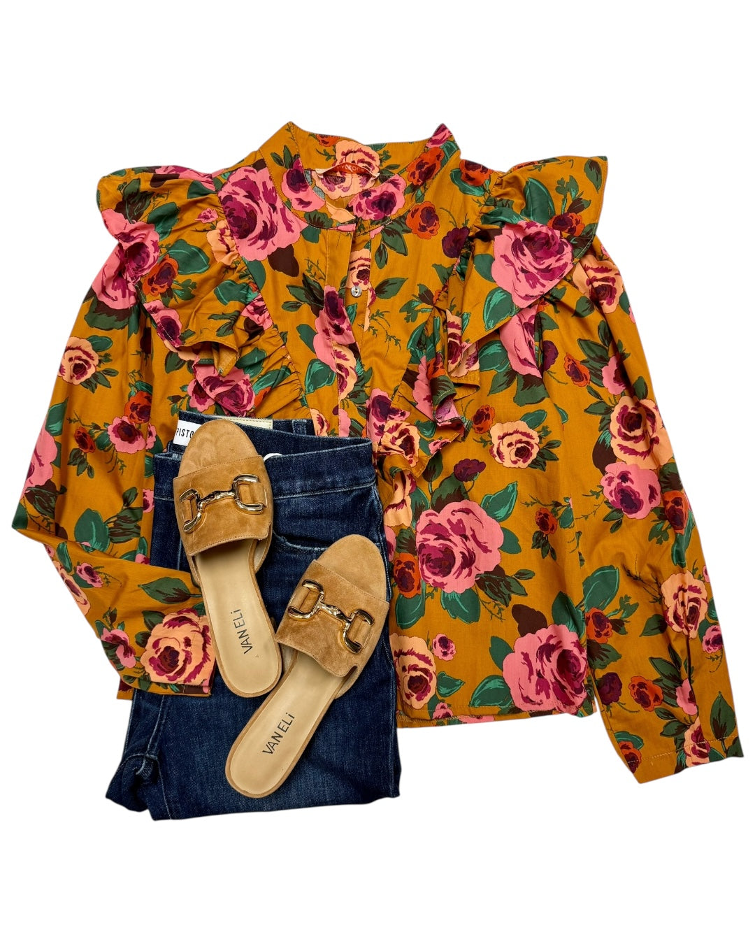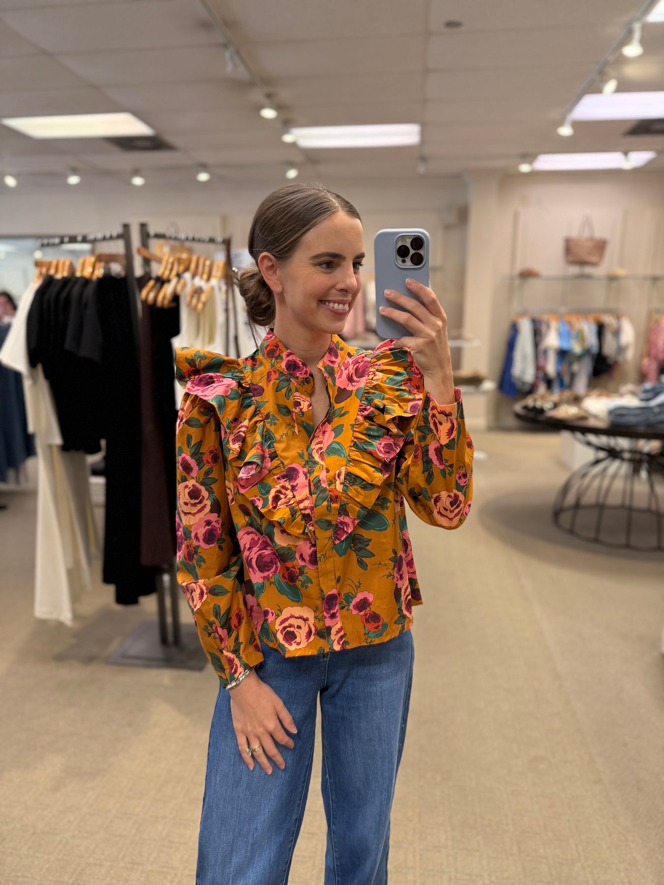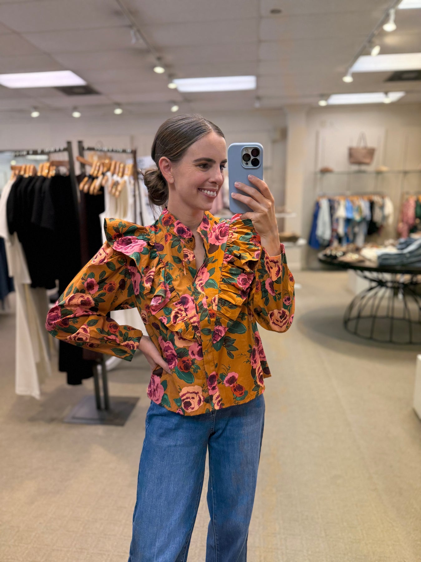 Vibrant, floral printed ruffle long sleeve blouse. Fitting true to size, also available in store!