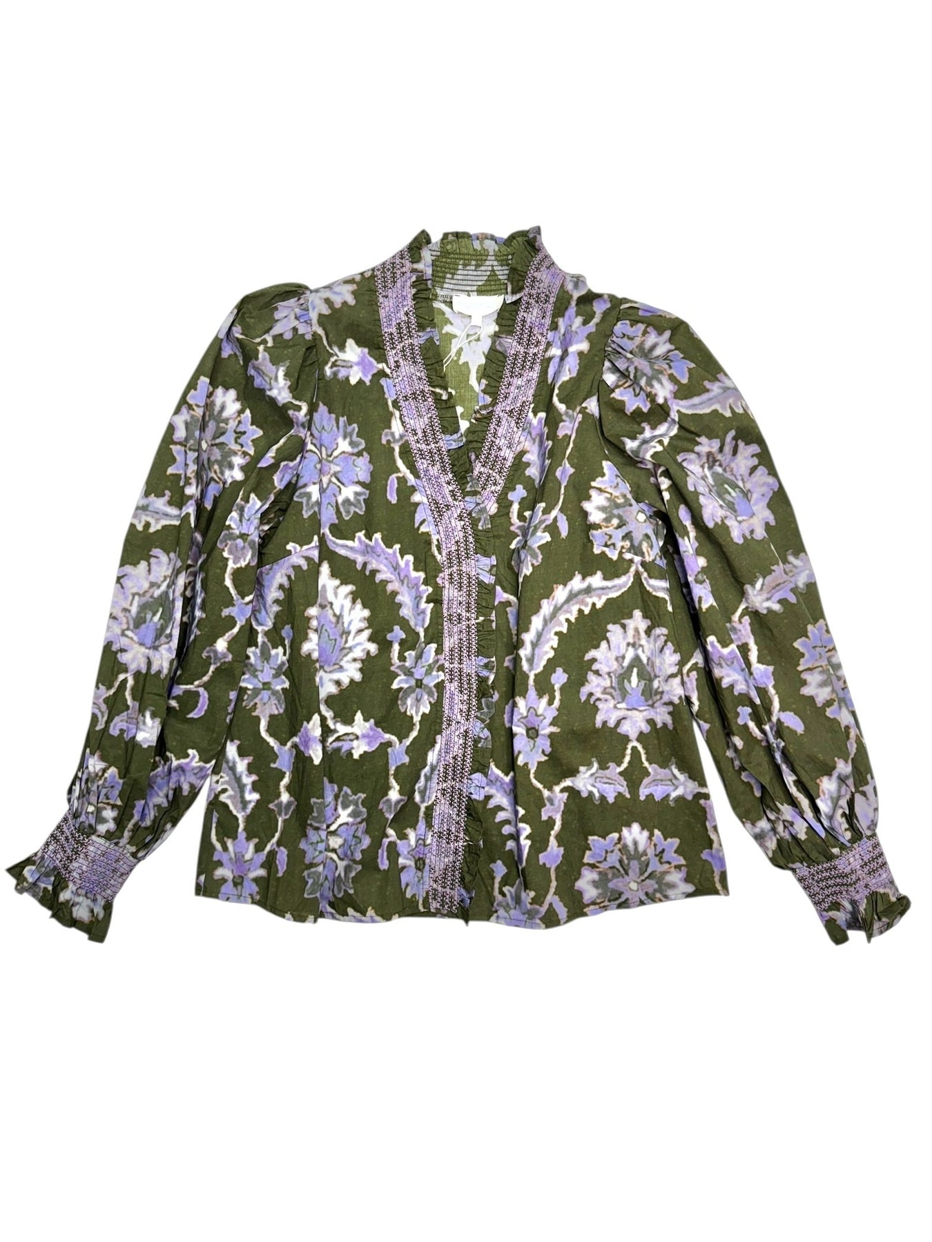 A floral print blouse featuring a smocked neckline and cuffs with subtle ruffle detailing. Designed with a relaxed silhouette and statement lavender-and-olive pattern. Pair with denim and boots for an effortless fall look. Also, available in-store