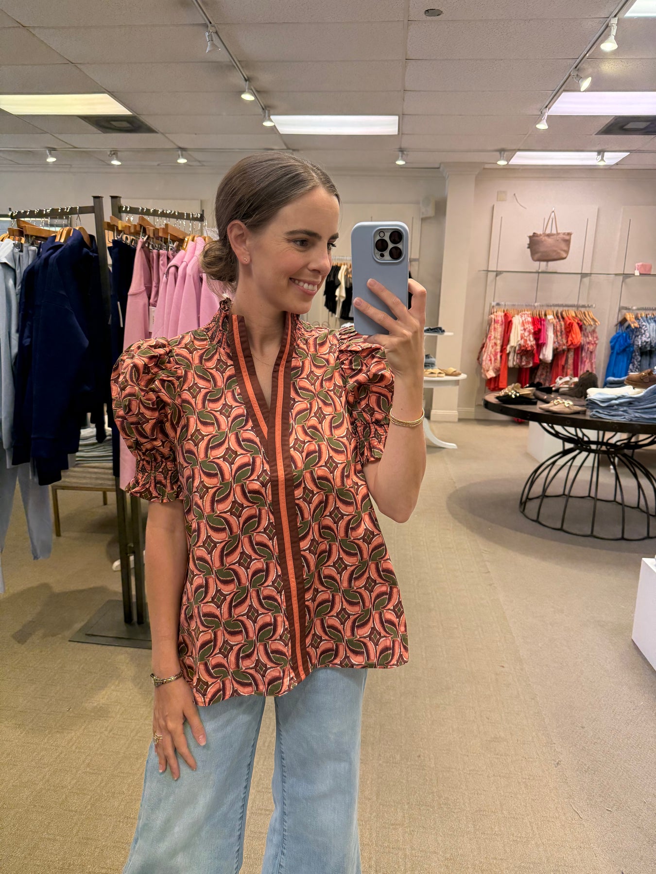 Plum and terracotta printed puff sleeve vneck blouse. Sleeve hem features a slight ruffle and smocking detail. Back of the neckline also features some smocking. Fitting true to size. Also available in store!