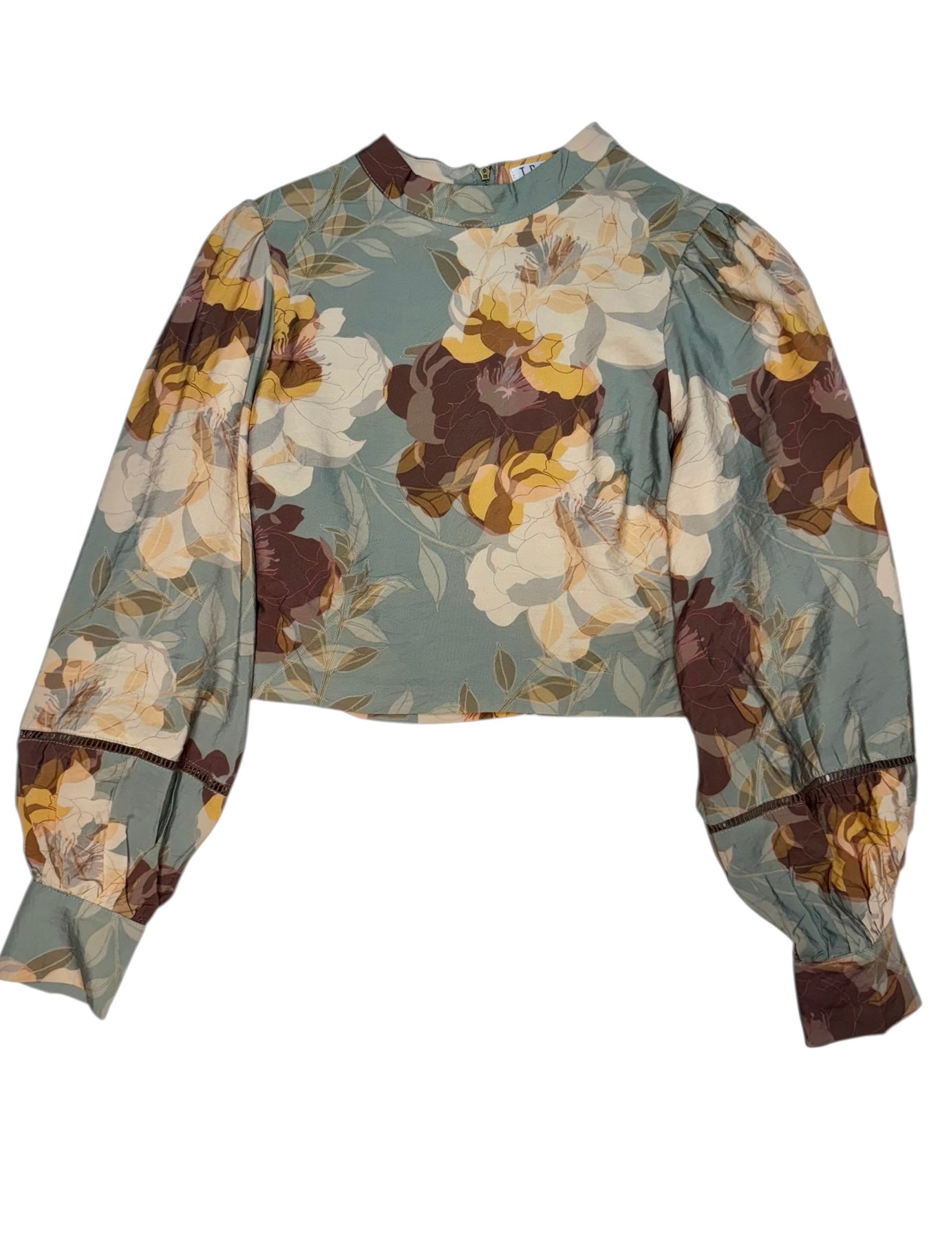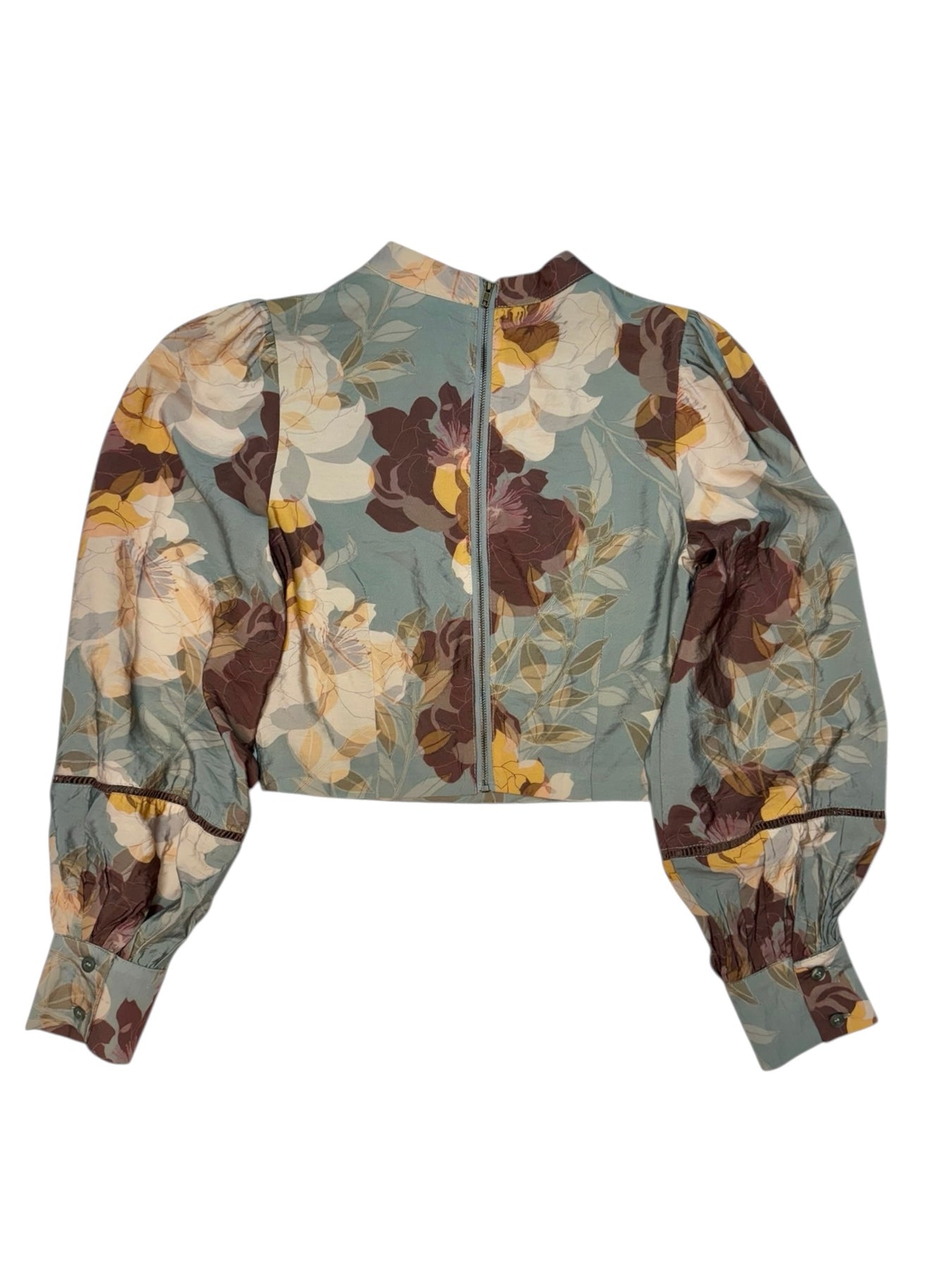 A floral print crop top featuring a mock neckline and long puff sleeves with buttoned cuffs. Detailed with ladder lace insets and a back zipper closure. The boxy silhouette pairs perfectly with the matching skirt. Also, available in-store