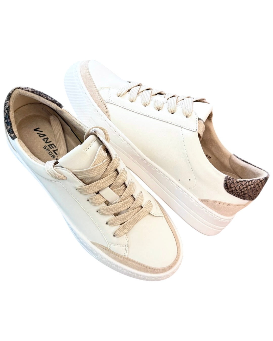 Ivory, platform laceup sneaker. Laces are blush. Features a animal printed back tab. Contrasting leather color on toe and heel is nude. Great neutral sneaker transitioning into fall! Fitting true to size. Also available in store!