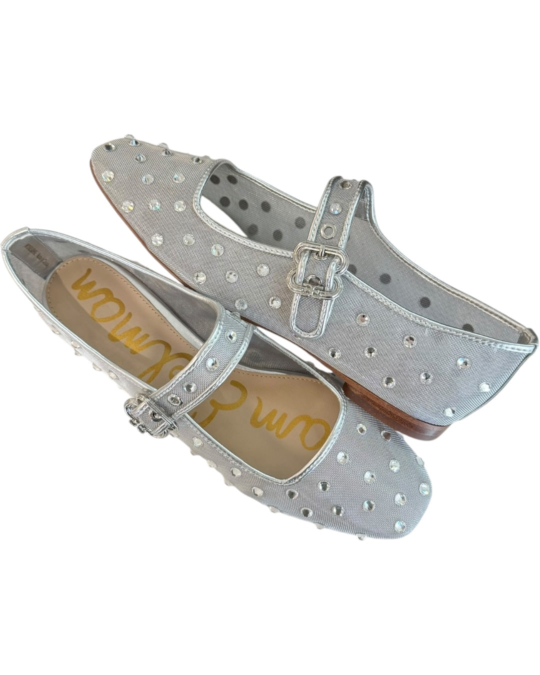 Silver, mesh mary jane flat with jewels by Sam Edelman. Fitting true to size. Also available in store!