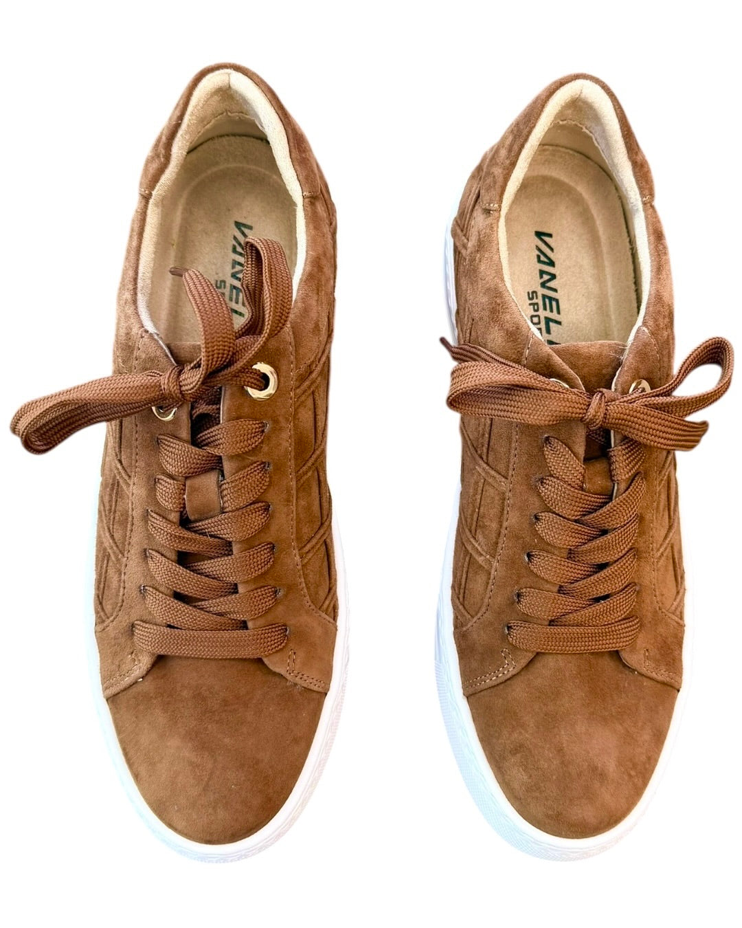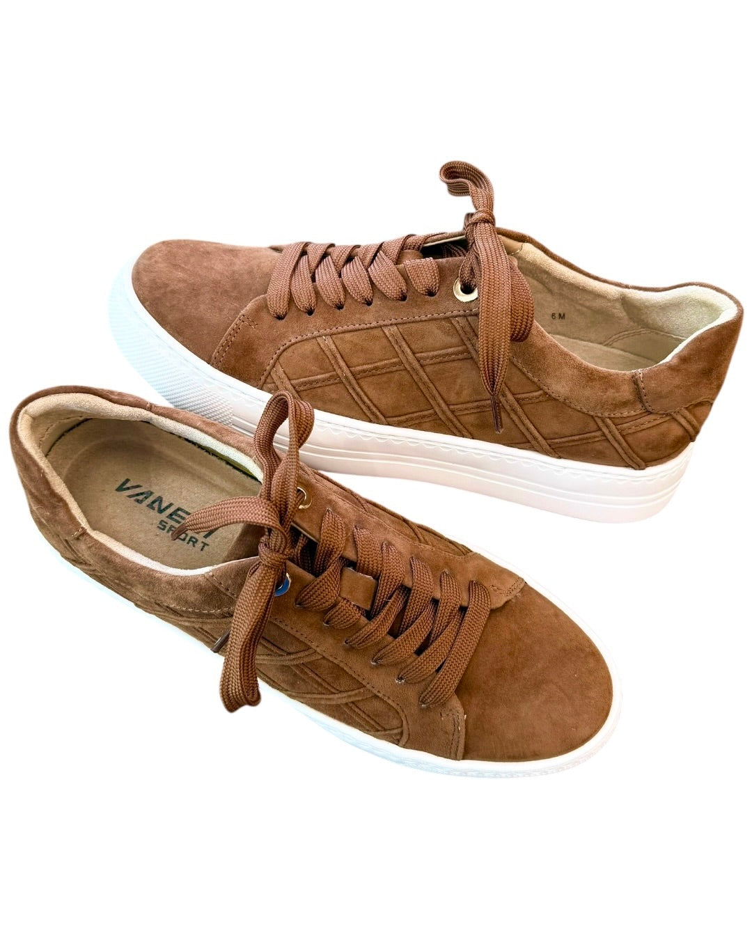 Brown suede, laceup platform sneaker by Vaneli. Fitting slightly narrow in the toe box. Also available in store!