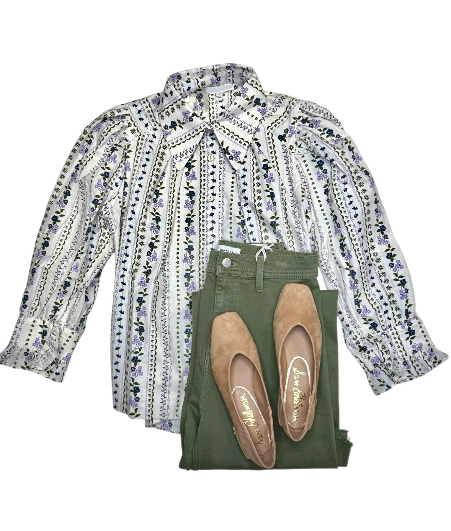 Long sleeve, button down, collard top featuring an olive, navy, and lavender print and finished with ruffled cuffs and button-front closure. Also, available in-store.