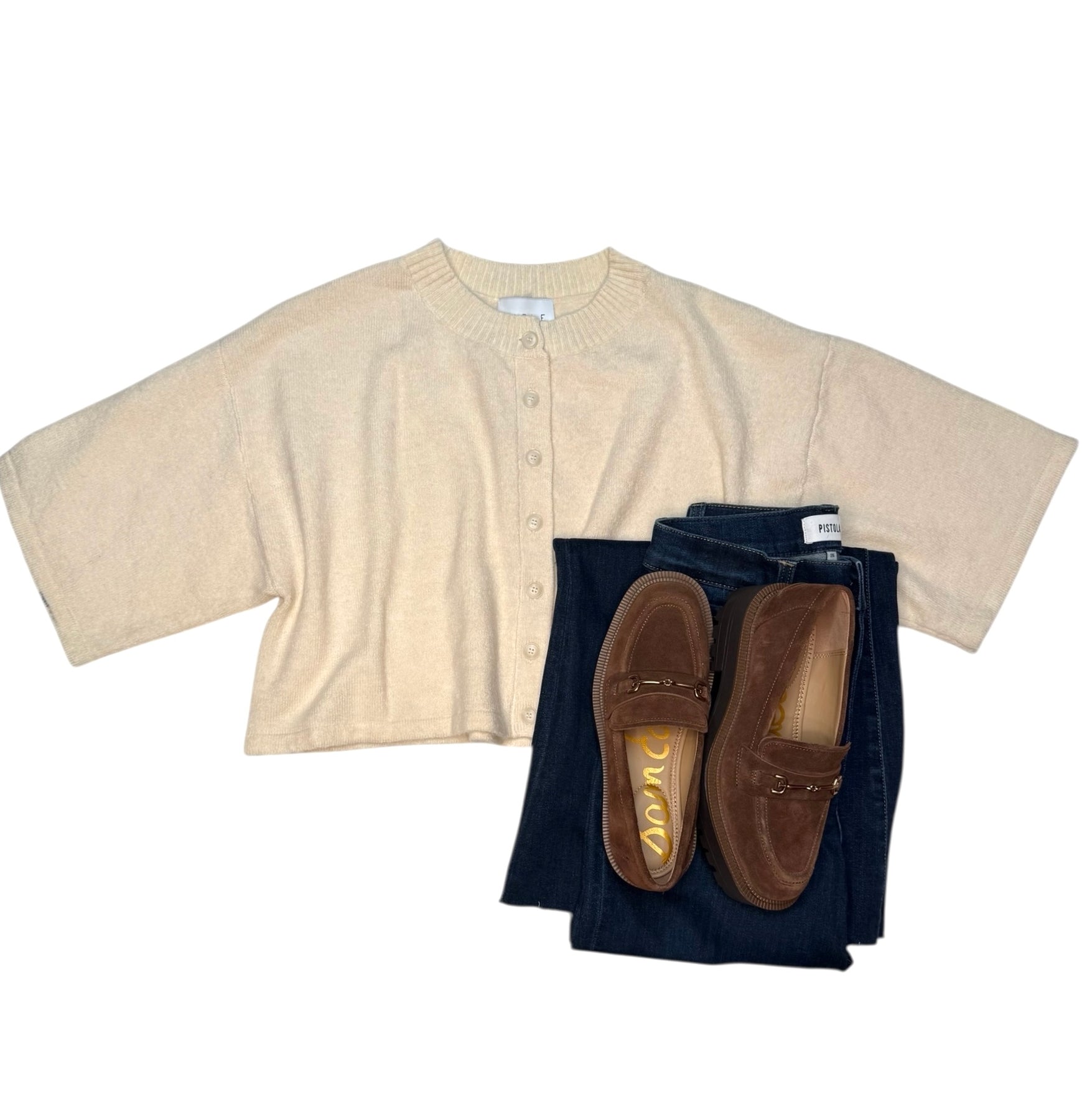 Knit button down sweater with ribbed neckline detailing. Also available in-store