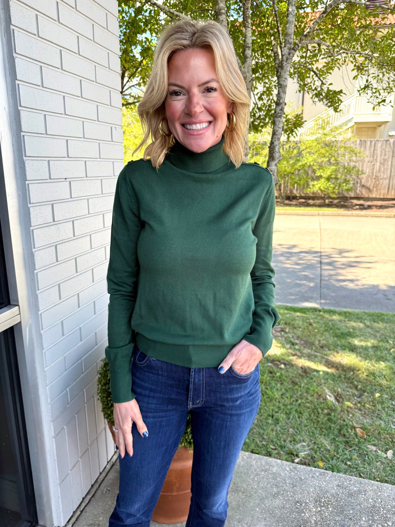 This cozy turtleneck sweater features gold button accents on the shoulders.