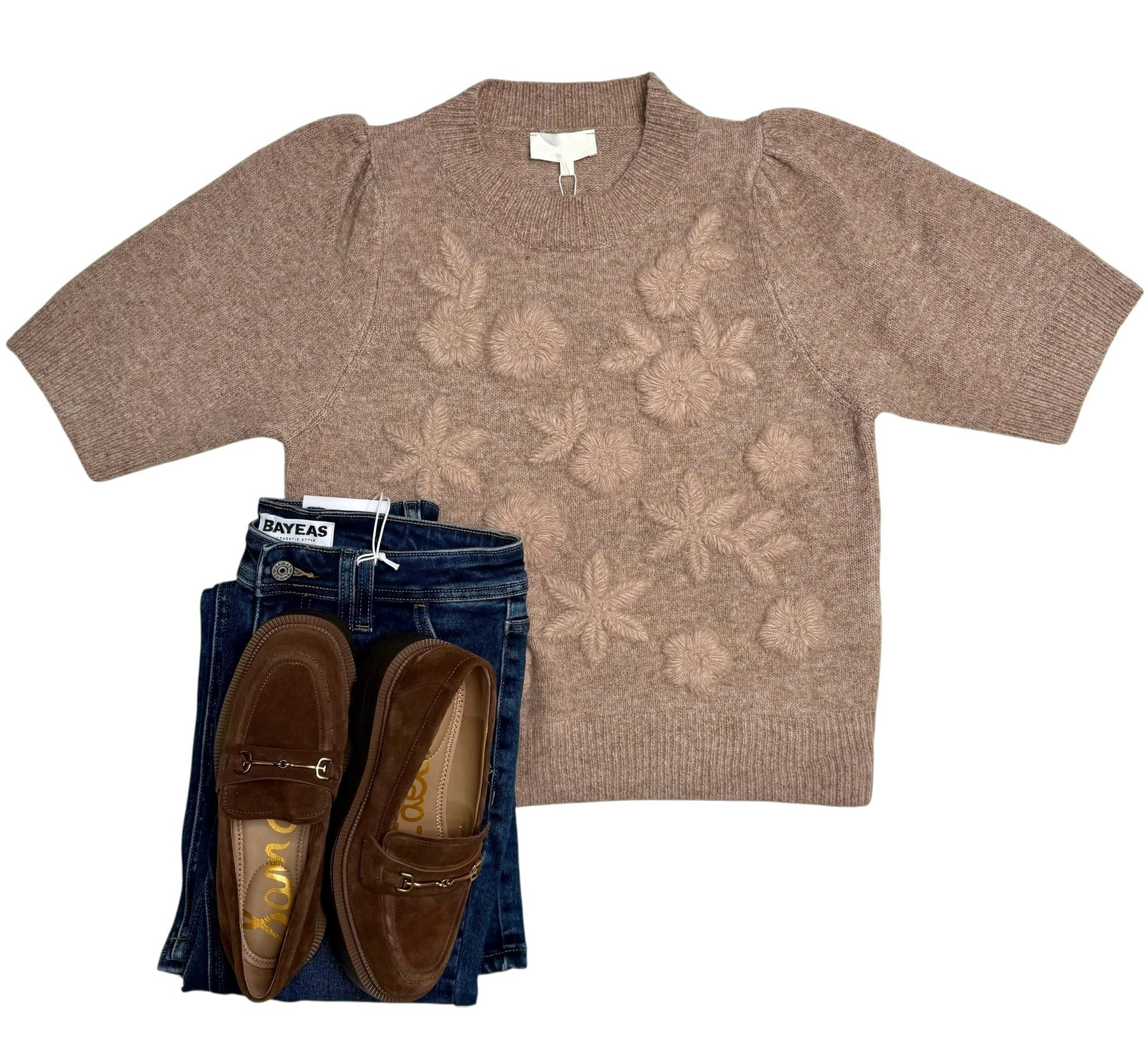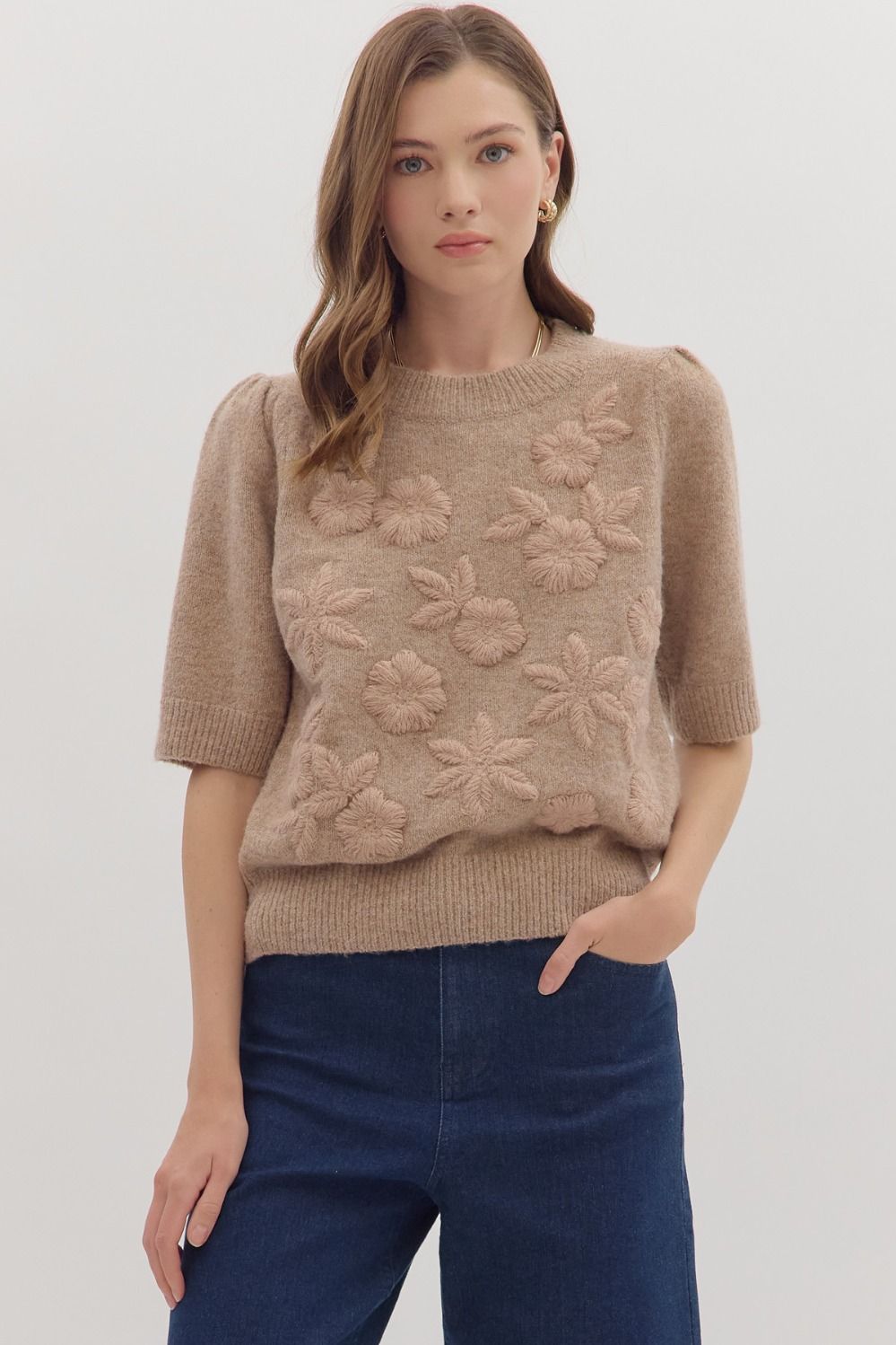 Short sleeve, knit sweater with crew neckline and 3D floral applique detailing on the front.