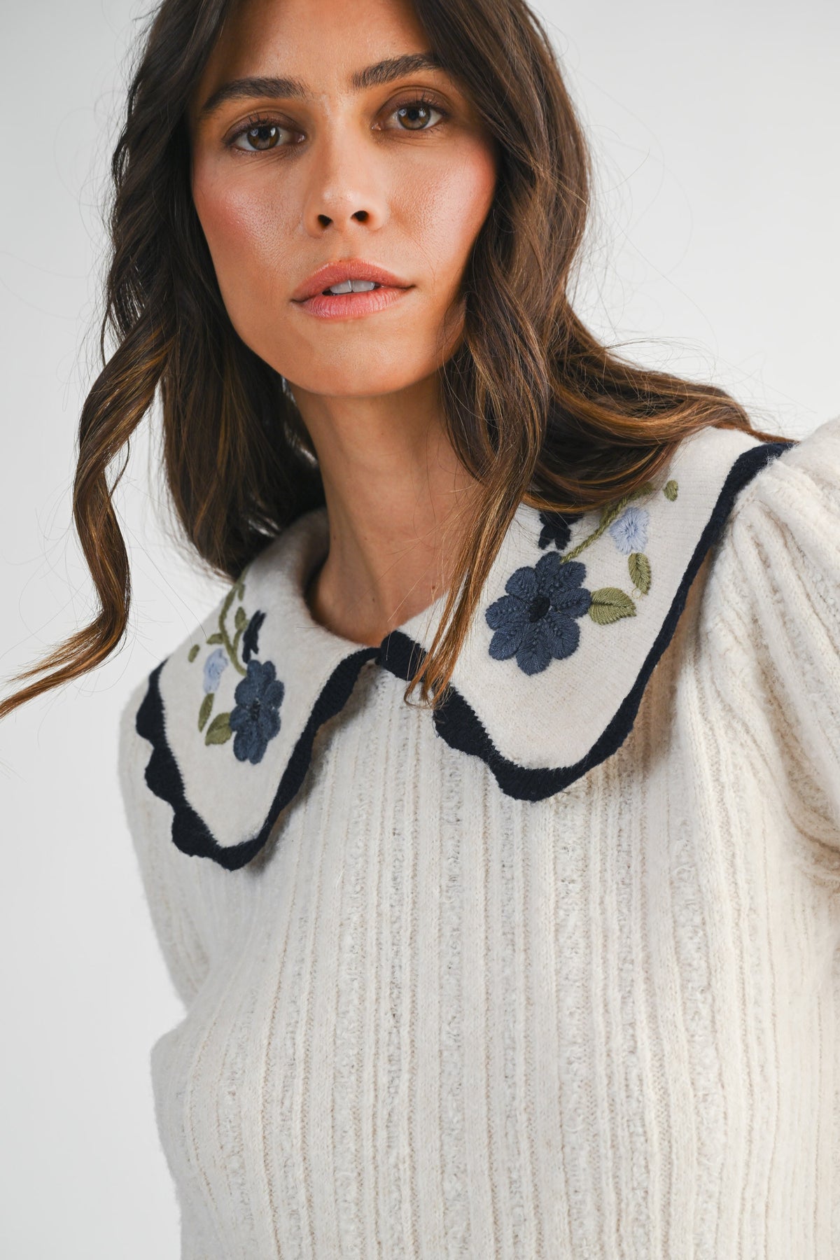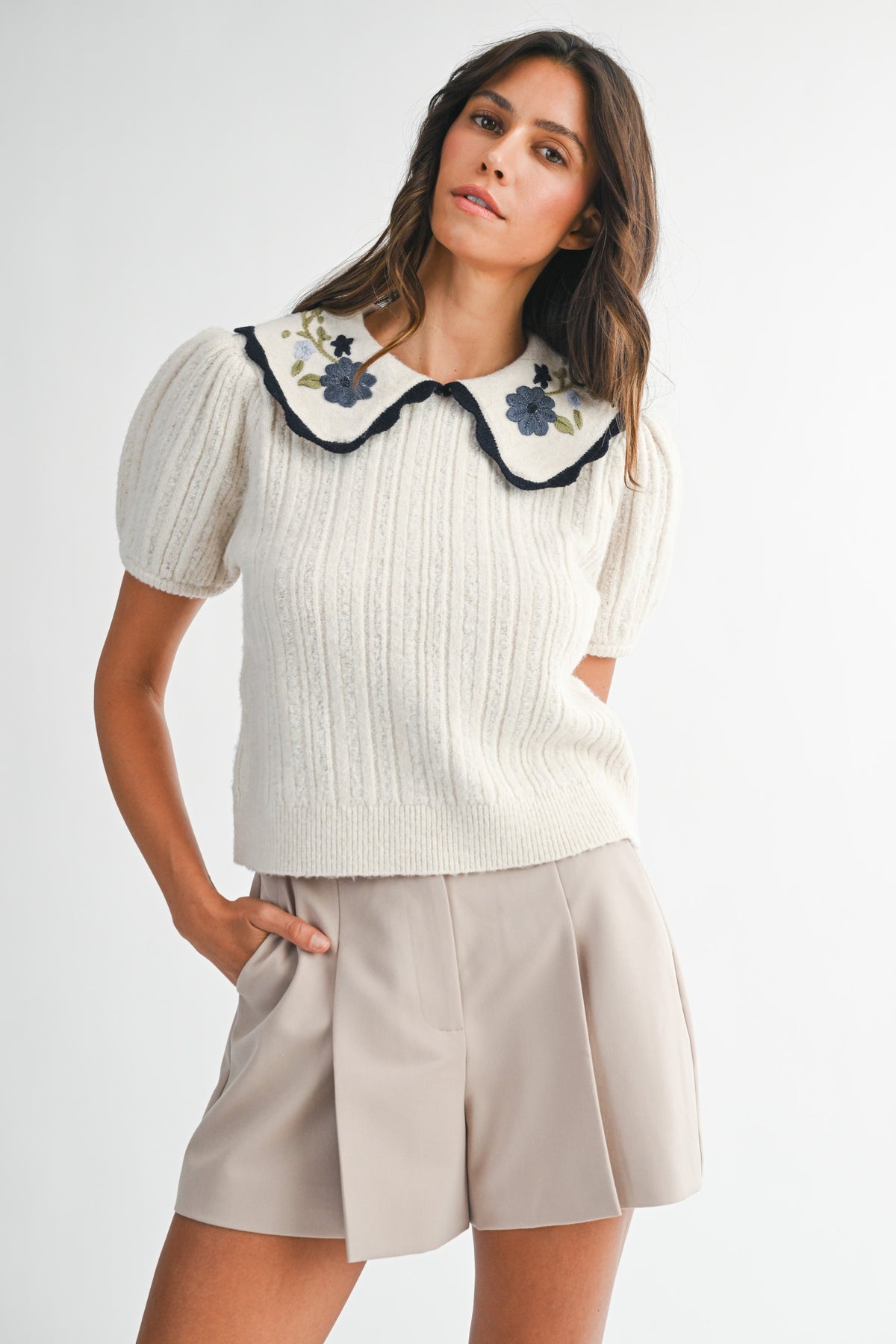 A ribbed knit sweater featuring short puff sleeves and a contrasting embroidered floral collar. Designed with a slightly cropped fit for a sweet, vintage-inspired touch that pairs perfectly with high-rise denim or skirts. Also, available in-store