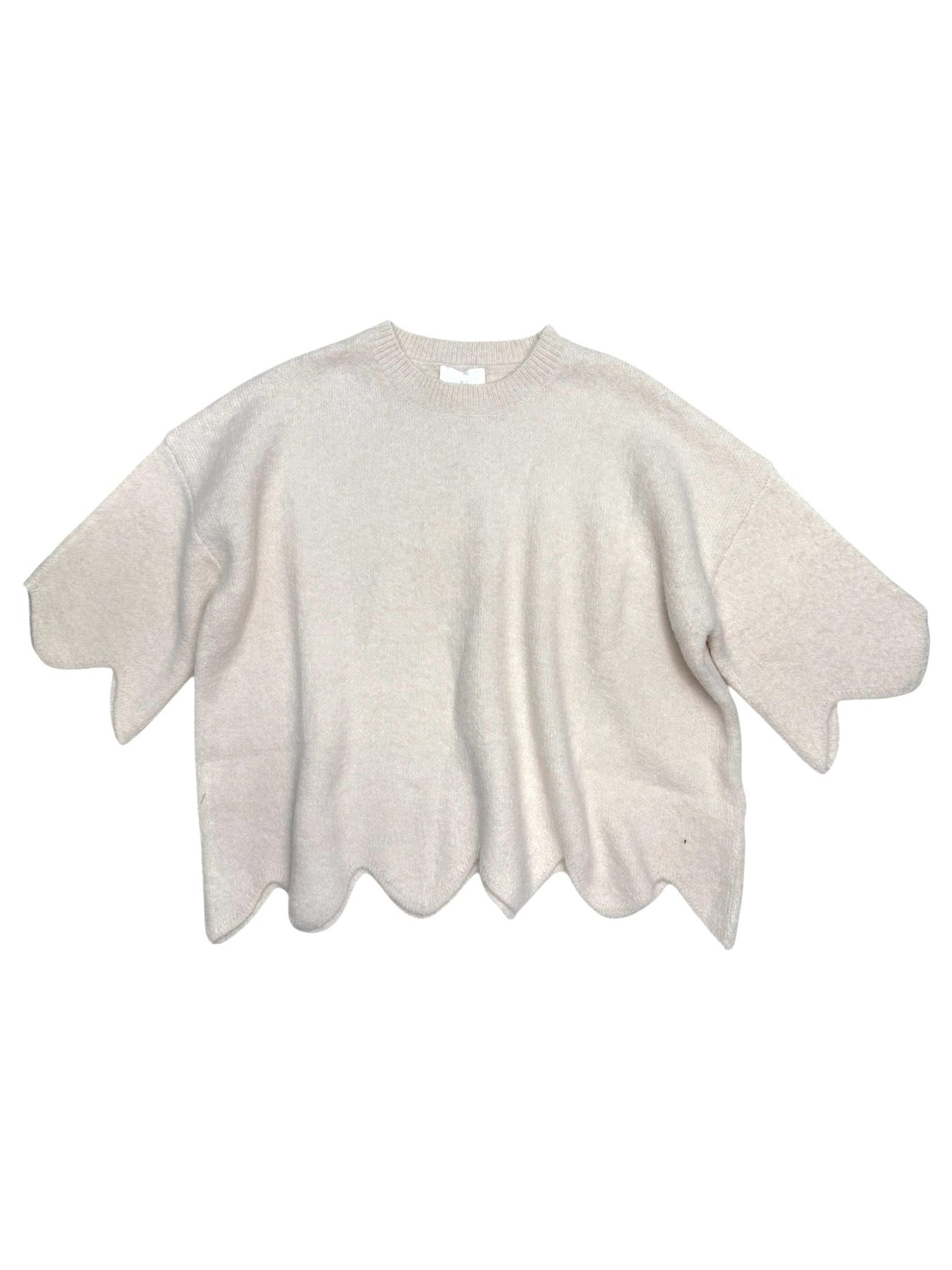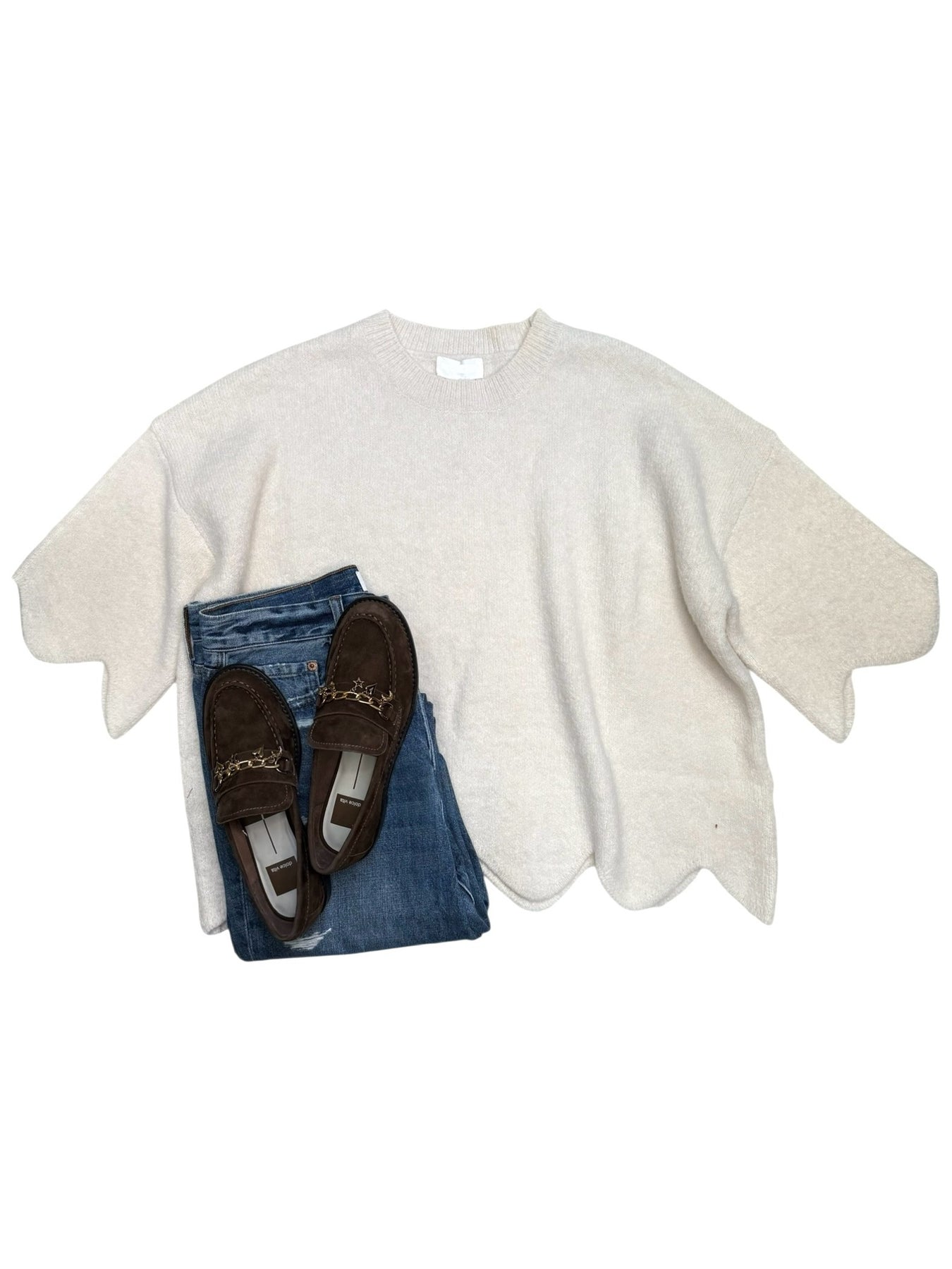 A soft knit sweater featuring a crew neckline and unique scalloped hem detail. Designed with a relaxed silhouette and mid-weight feel, perfect for pairing with denim or leather bottoms. Also, available in-store