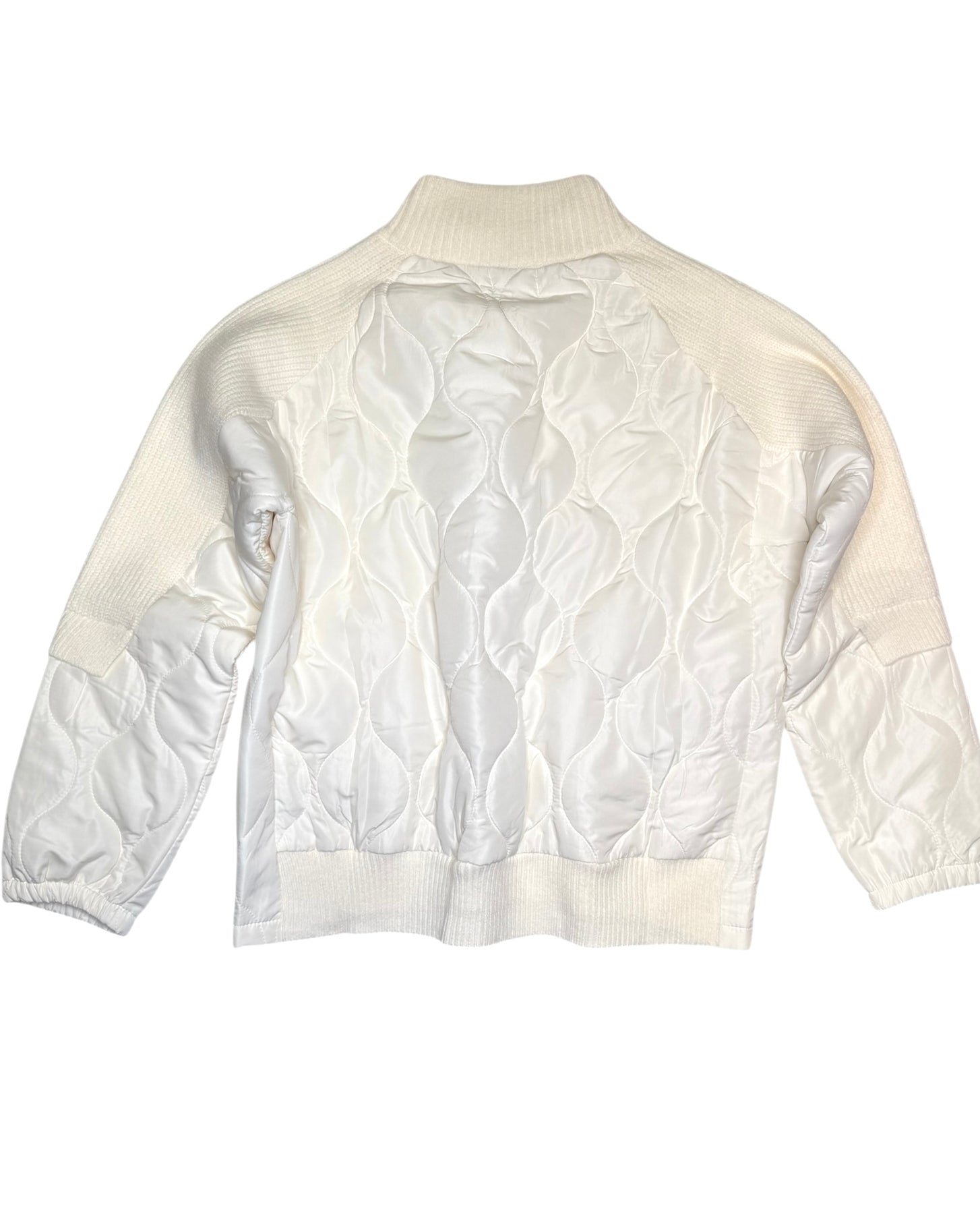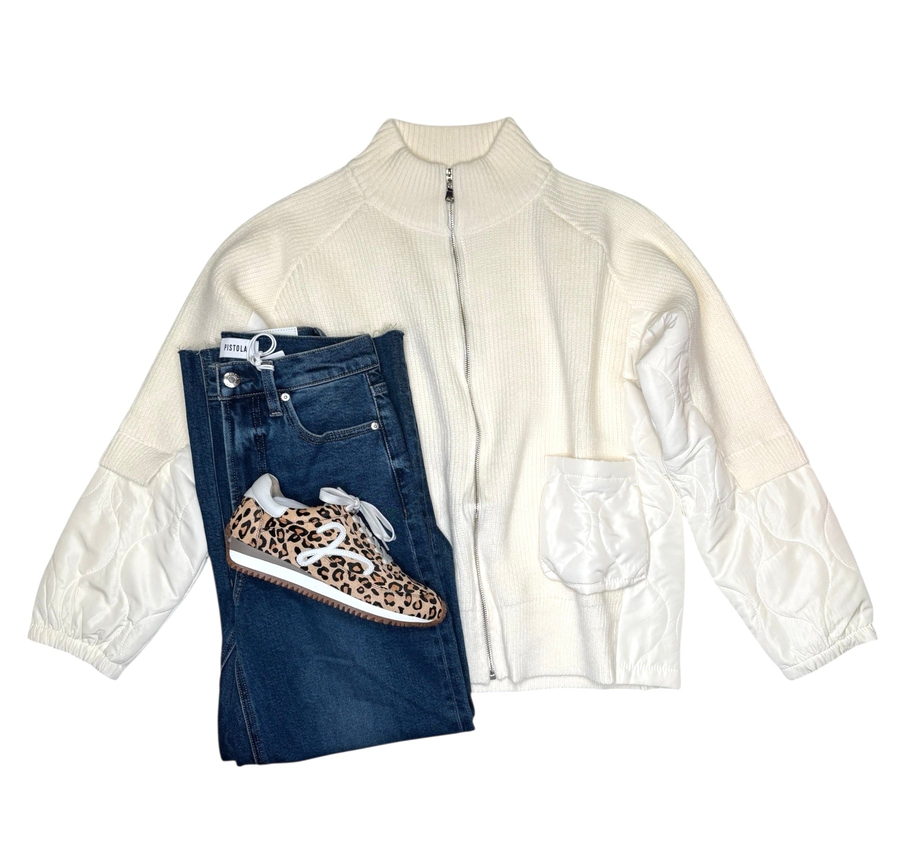 Zip-up sweater with mock neckline and front pockets. Sweater blends a ribbed knit body with quiled sleeves and back. Also, available in-store.