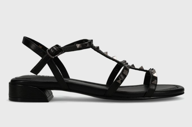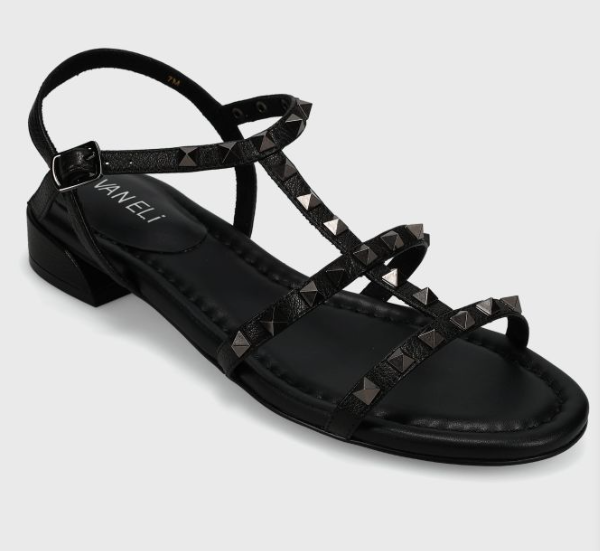 T-strap leather or cork sandal with metal pyramid studs. Buckle strap with hidden elastic insert. Padded insole. Rubber sole. 1 inch covered heel.