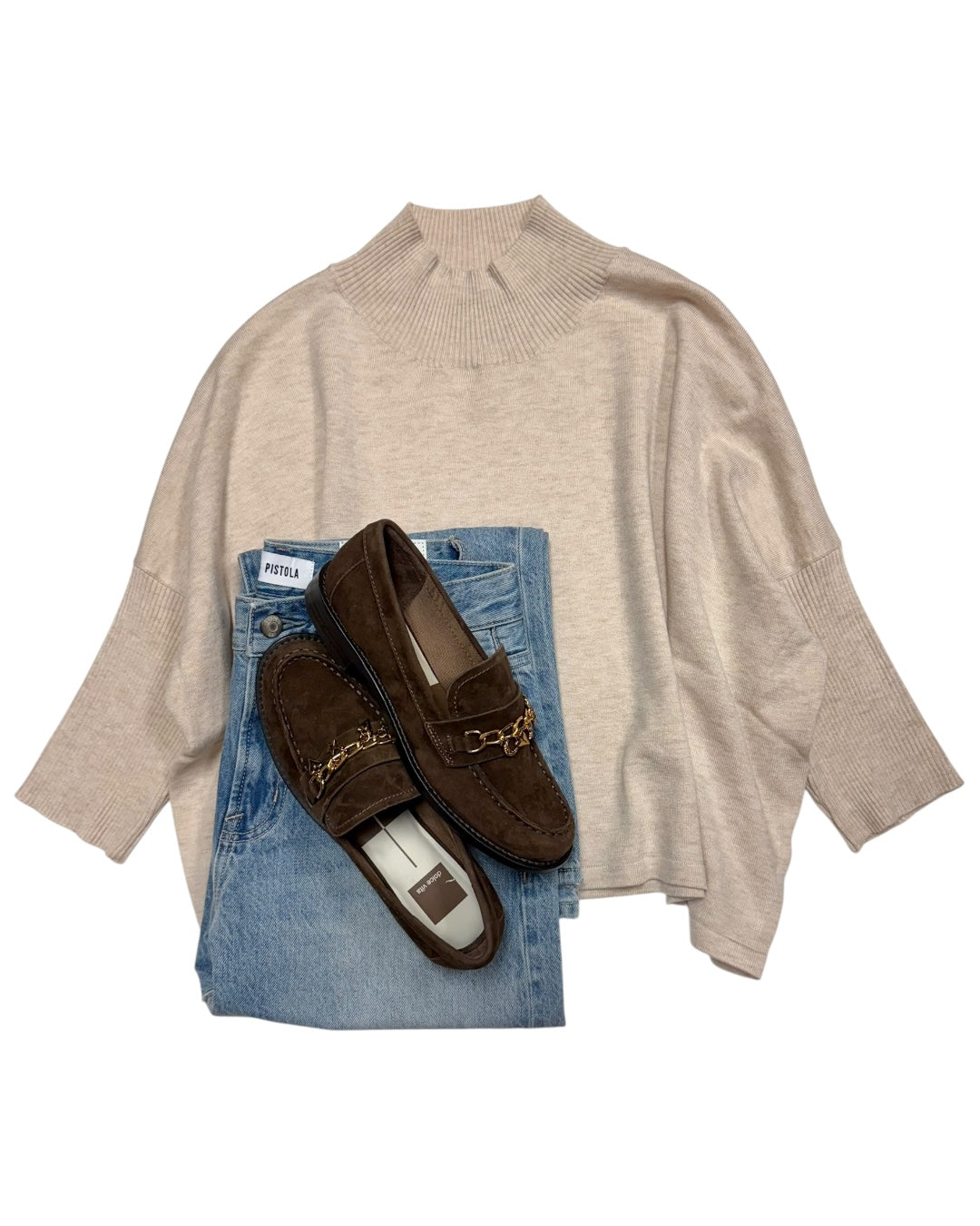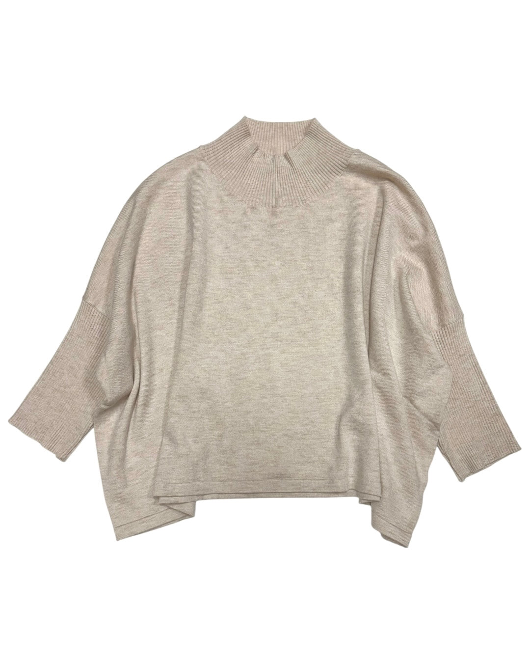 Three quarter sleeve dolman style sweater with a mock neckline. Loose fit. Slightly cropped, but not too high, perfect for a slight front tuck with a high waisted jean. Comes in ecru, fuschia, rust and black. One size fits most. Also available in store.