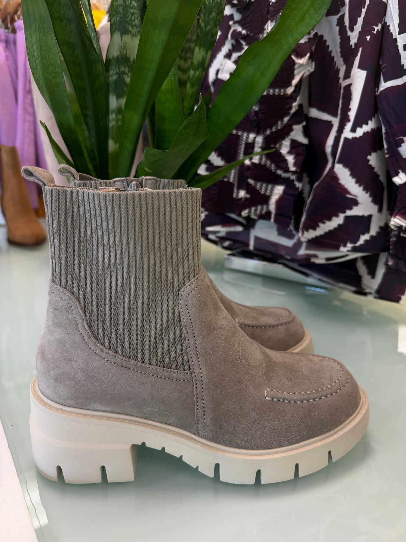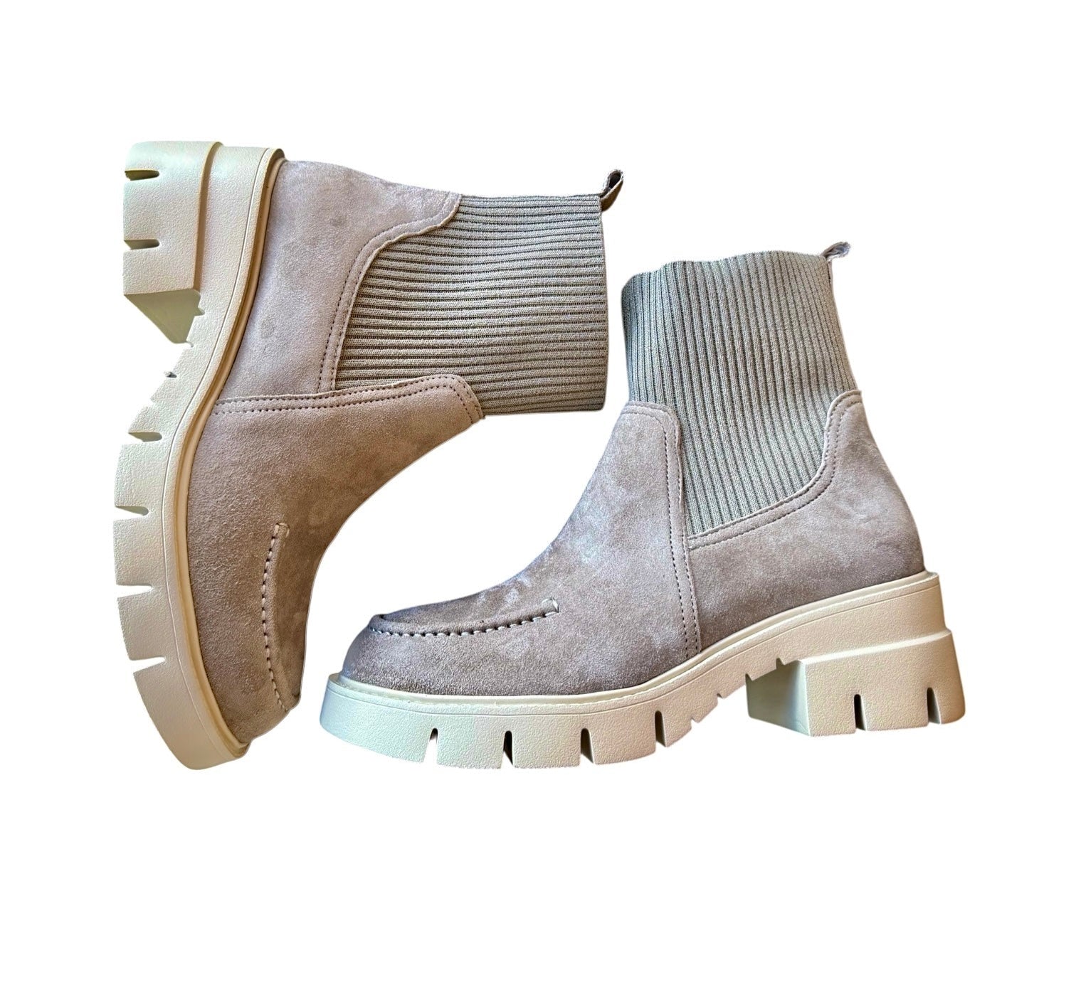 Lug sole ankle boot. Suede apron-stitched upper. Stretch knit shaft. Side zip. Ultra-padded insole. .75 inch front platform. 2 inch heel. Also available in-store