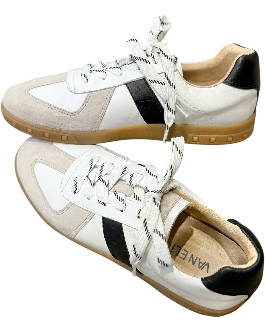 Combo suede lace up sneaker by Vaneli. Available in a black/grey and a camel/calf hair. Fitting pretty true to size. Running slightly narrow, size up if in between. Also available in store!