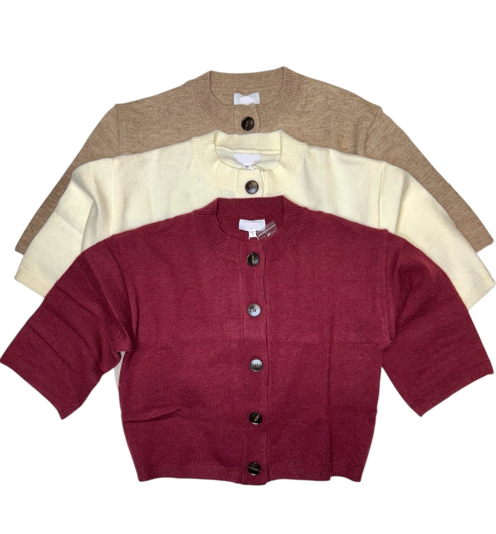 Knit cardigan sweater with buttons. Also, available in-store.