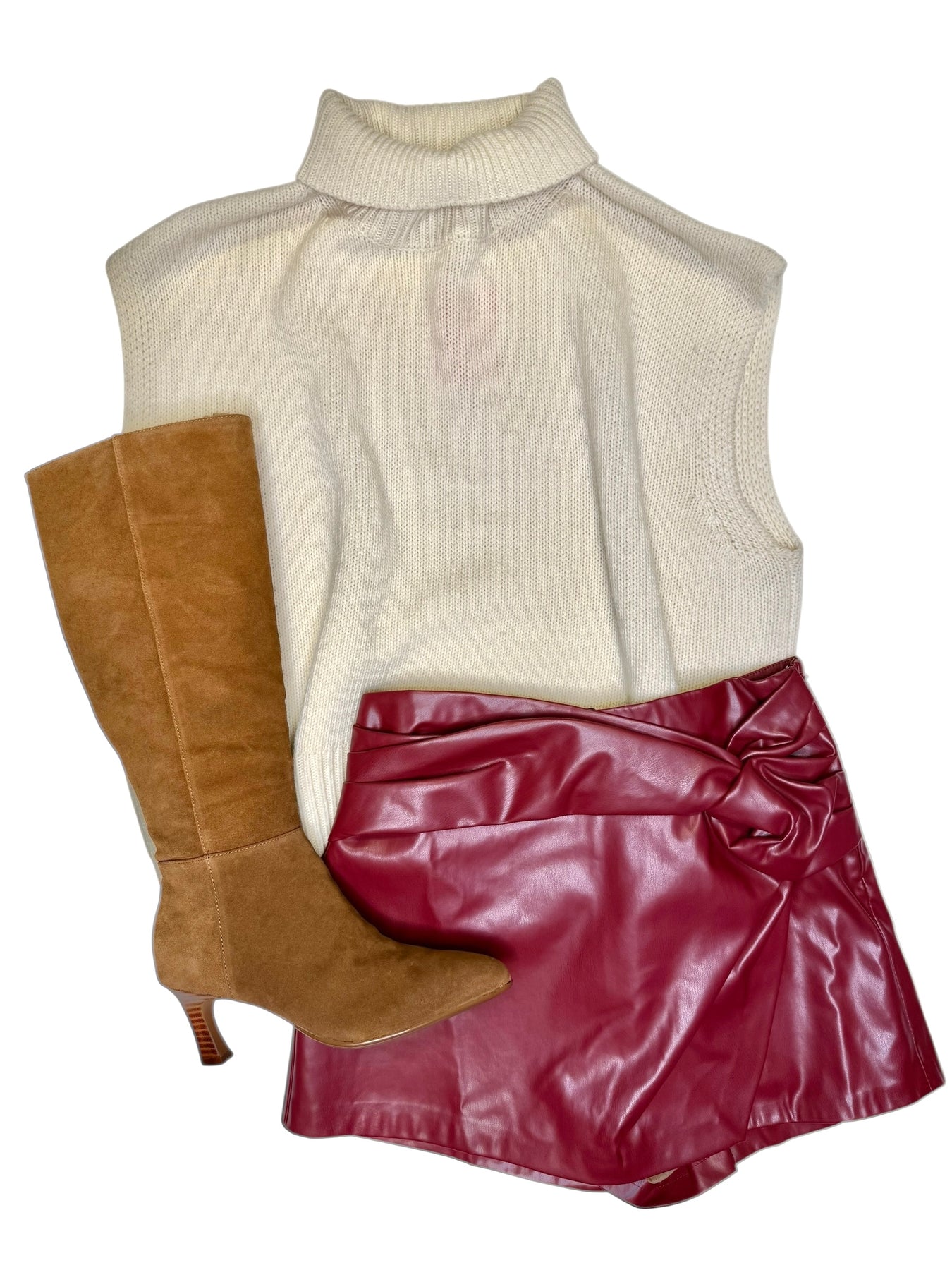 Faux leather skort with back zipper closure, and side knot design for a fun twist on a clasic piece. Also, available in-store.