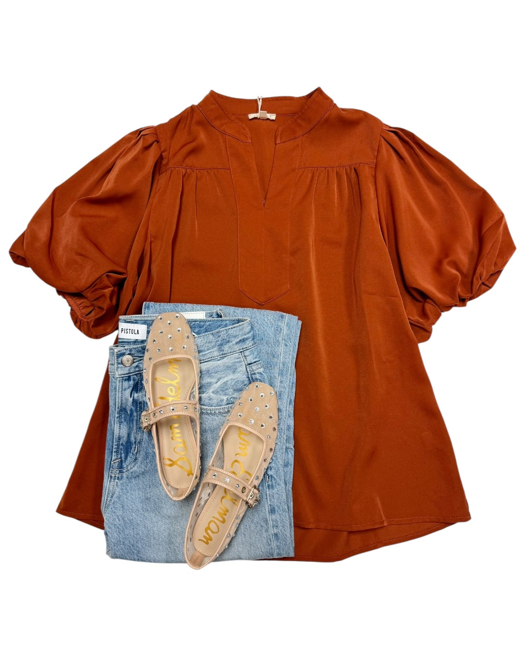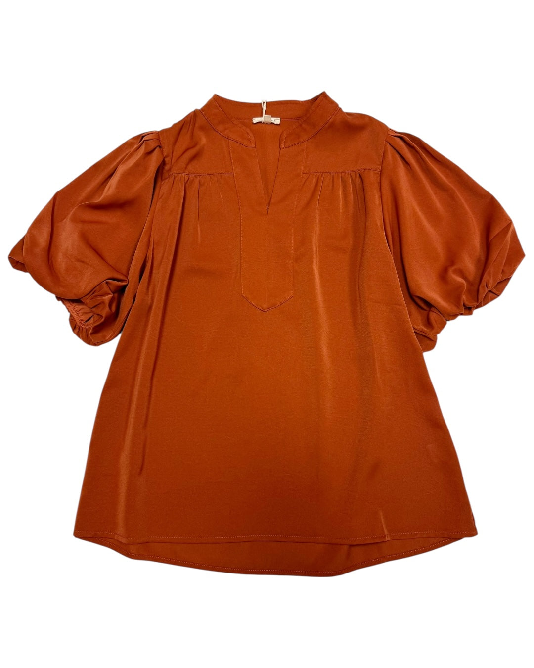 Carmel colored, puff sleeve vneck blouse. Flowy fit. If in between sizes we recommend sizing down. Also available in store!