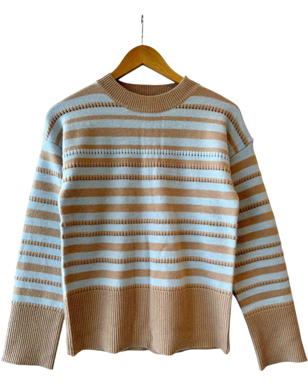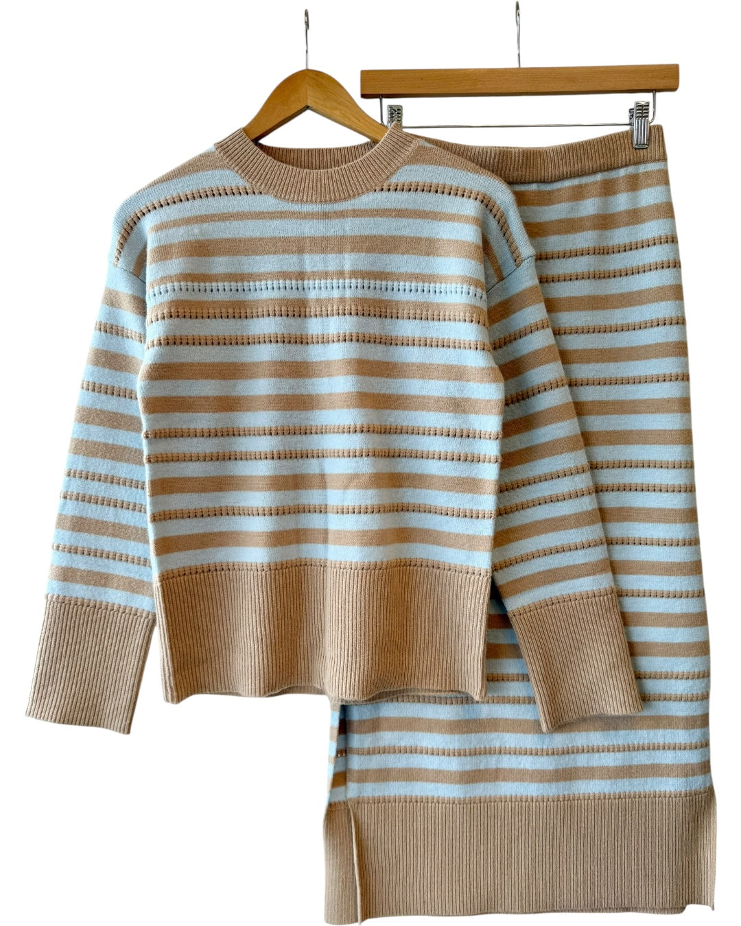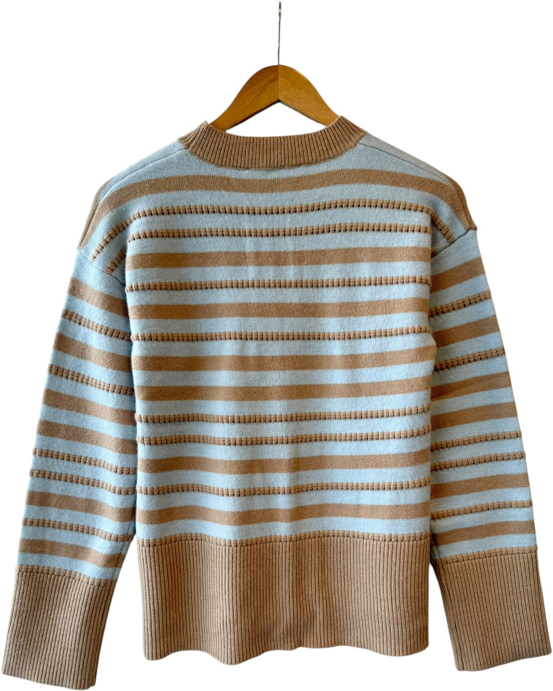 Light blue and cream striped knit sweater. Made of 47% acrylic, 30% polyester, and 23% nylon. Pairs well with the Sweater Knit Midi Skirt. Fitting true to size, also available in store!
