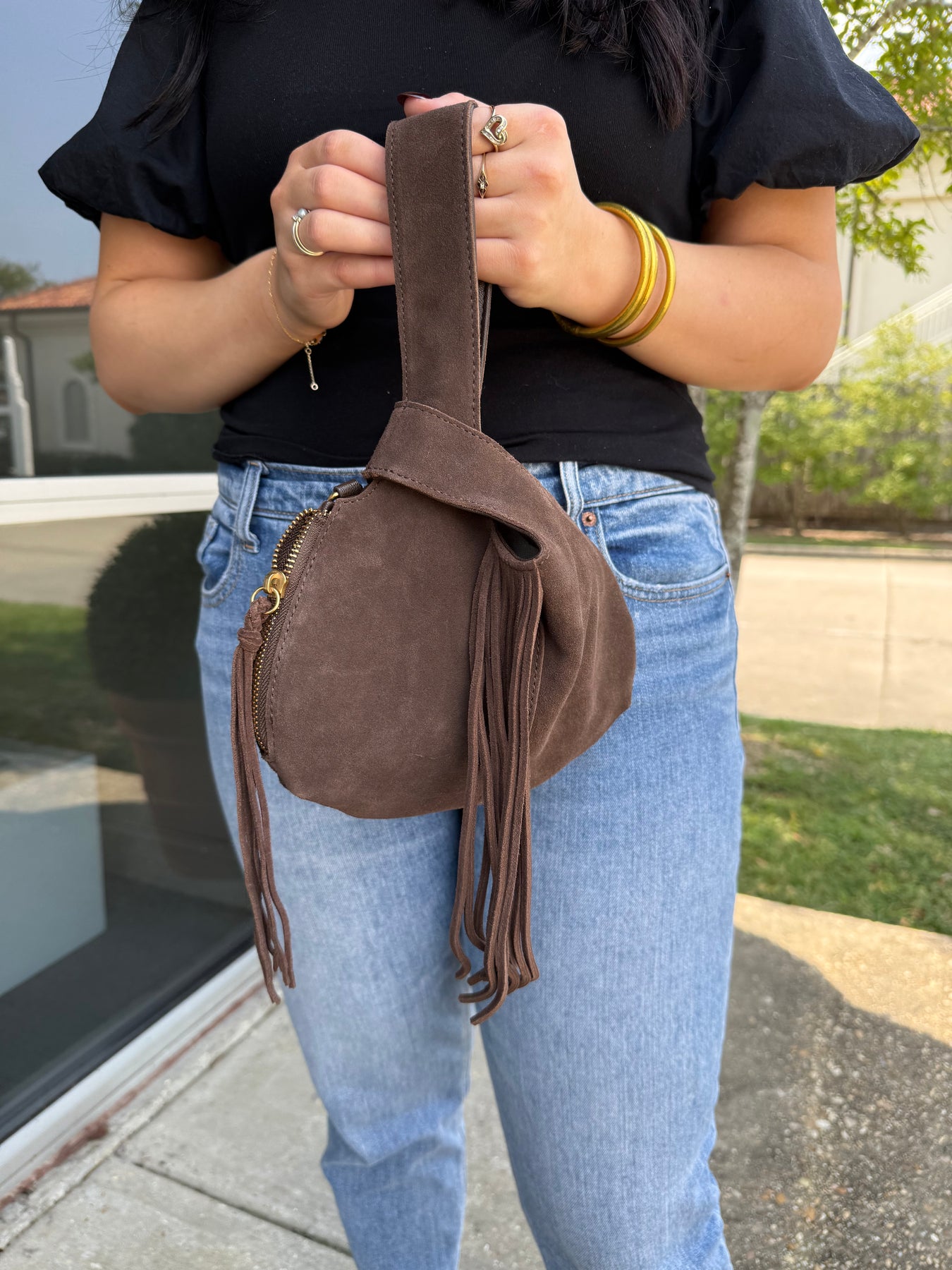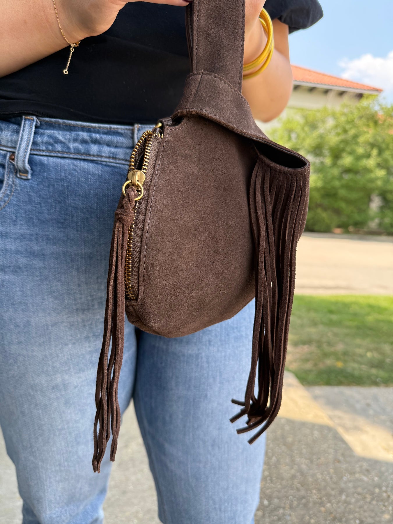 Brown suede, pull through wristlet. Features an inner side zipper and pouch. Measures 9x6x1inch. Also available in store!