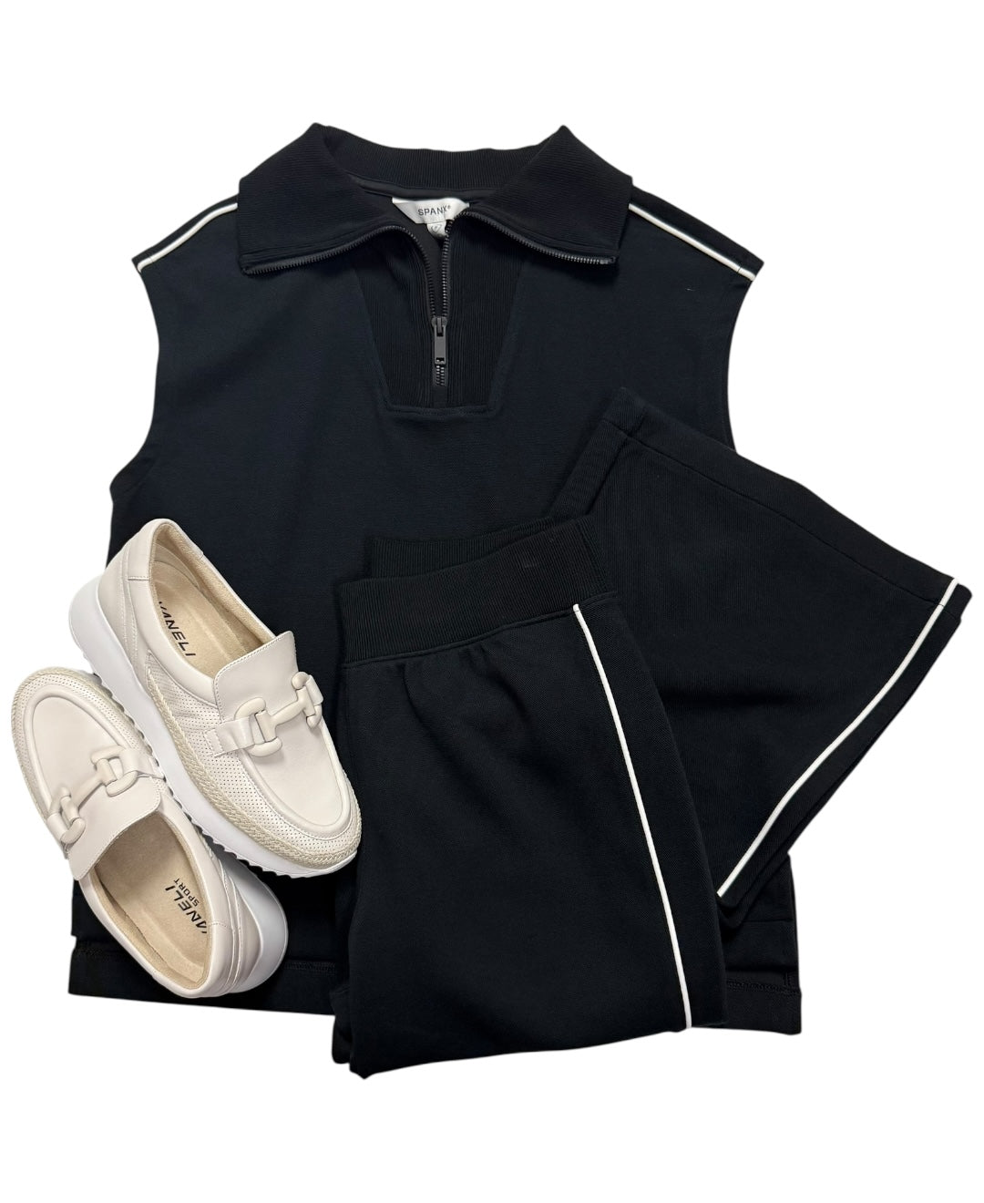 Black sleeves half zip with white trim detailing. Pairs well with the airpique flare track