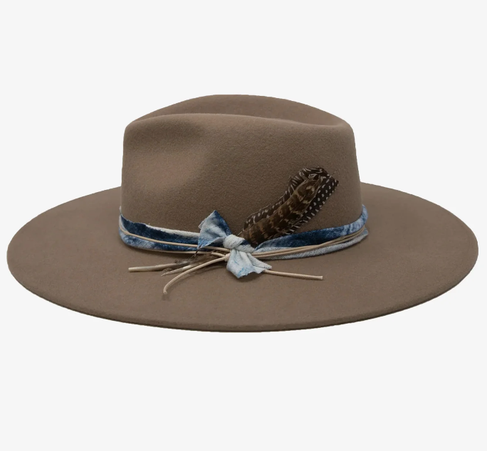 The Amelia is made from 100% Australian wool felt and has a classic wide cut brim, featuring a jute rope tie and feather trim.