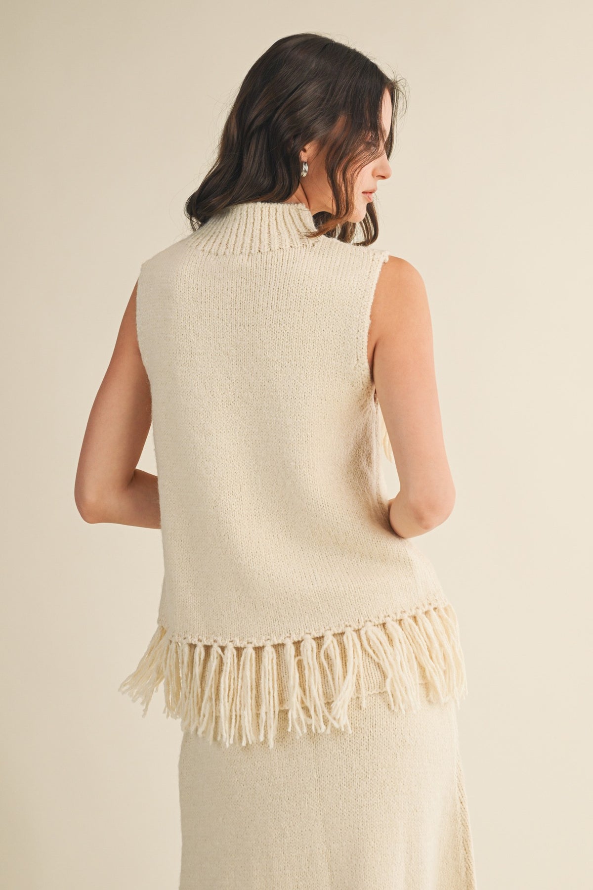 Knit sleeveless top with ribbed mock neck; designed with fringe across chest, and hem. Also, available in-store.