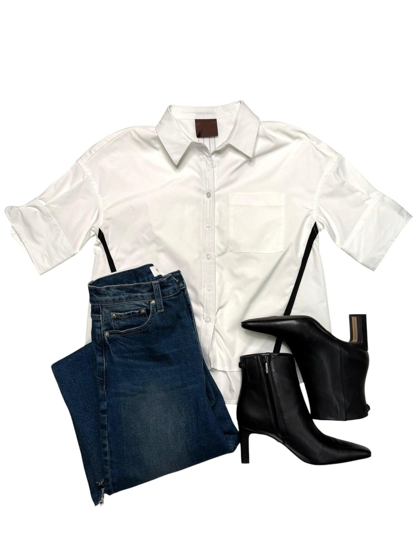 Short sleeve, collard button down top in white with front pocket and black contrast side stripe detail. Also available in-store.