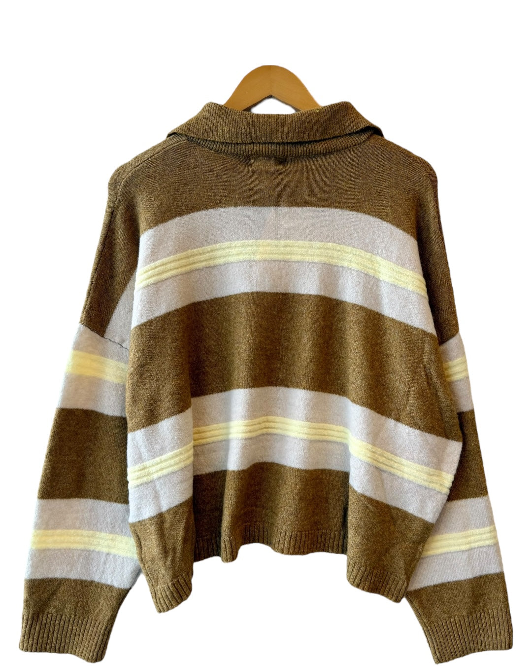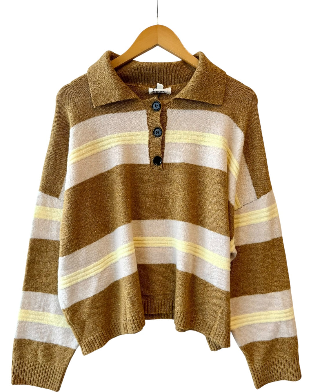 Striped long sleeve collared sweater. Has three black buttons doing down the front. Made of 76% polyester, 15% acrylic, 6% wool, and 3% spandex. Slightly oversized fit. Also available in store!