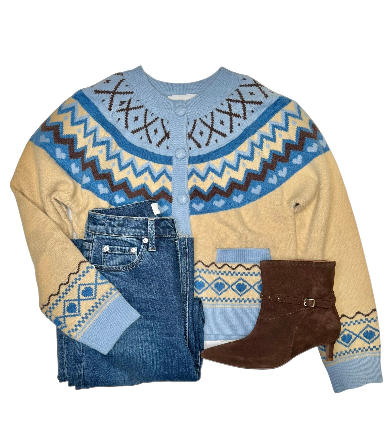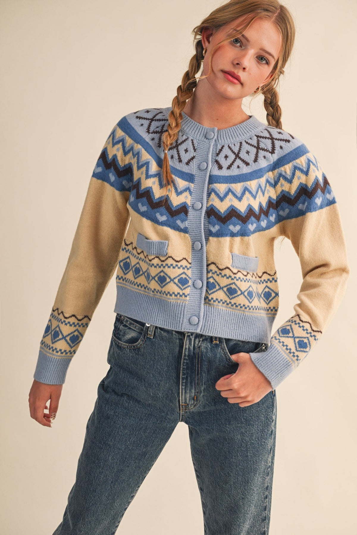 Fair isle long sleeve sweater cardigan with round neckline front pockets and relaxed waist length fit. Also, available in-store.