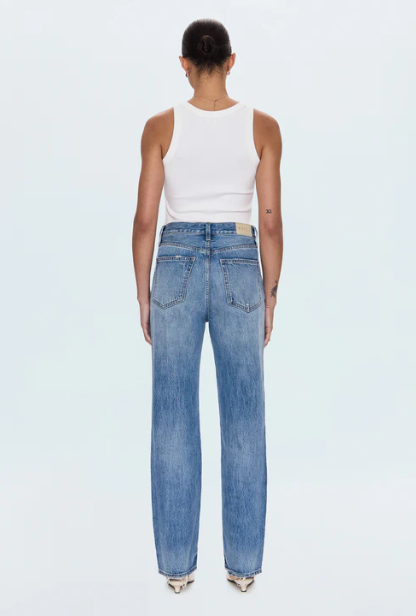 Cassie's super high rise creates a sculpted silhouette that's both commanding and comfortable, expertly scaled for smaller frames. The classic straight leg falls to a full-length hem, finished with a 31" inseam for perfect proportions. Crafted from Pistola's rigid denim in Serpentine Vintage, a medium blue wash with authentic vintage character and natural fading that feels effortlessly lived-in.