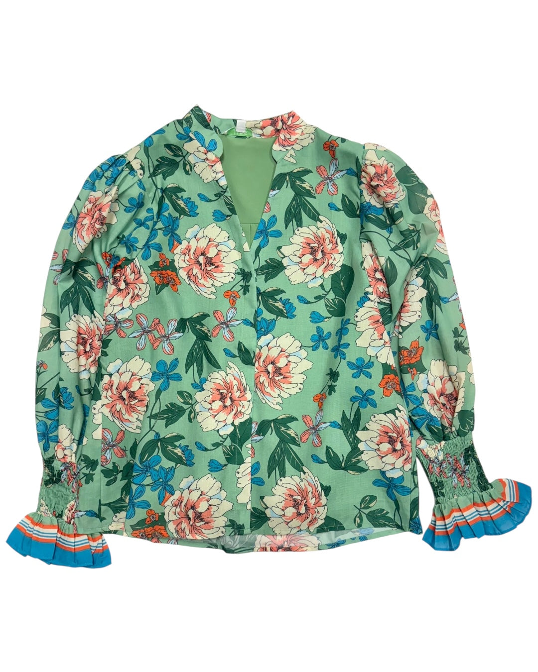 Green floral printed long sleeve vneck blouse. Featuring a smocked ruffle sleeve hem. Buttons down the front. 70% cotton and 30% polyester. Fully lined which is 100% polyester. Fitting true to size. Also available in store!