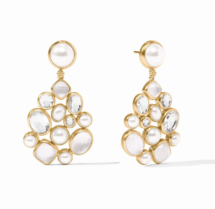 These showstoppingly sparkly earrings feature a mélange of gold-set gemstones in every size, shape, tone, and cut like bejeweled cobblestones, linked to a complementary rounded gem by a subtle granulated embellishment.
