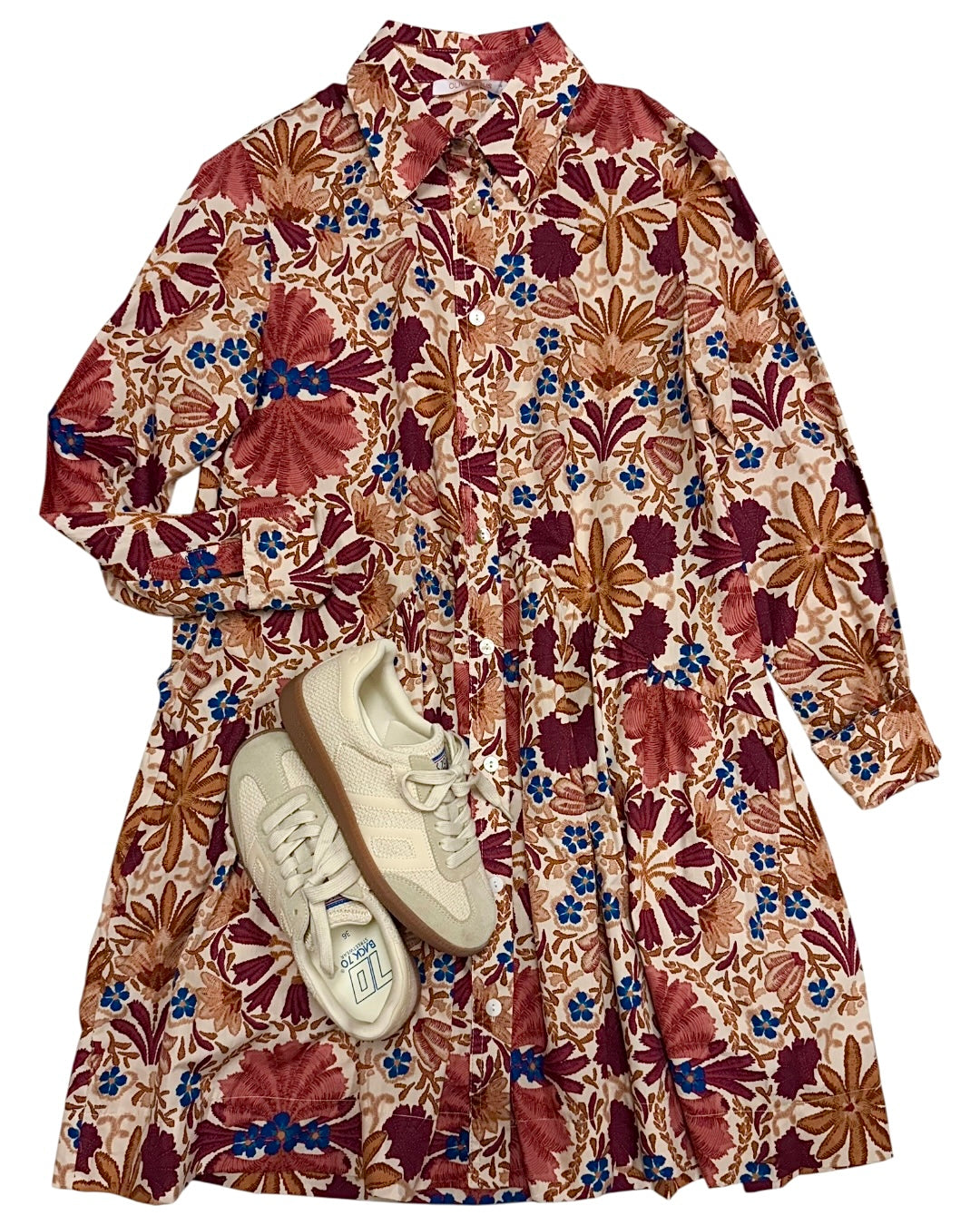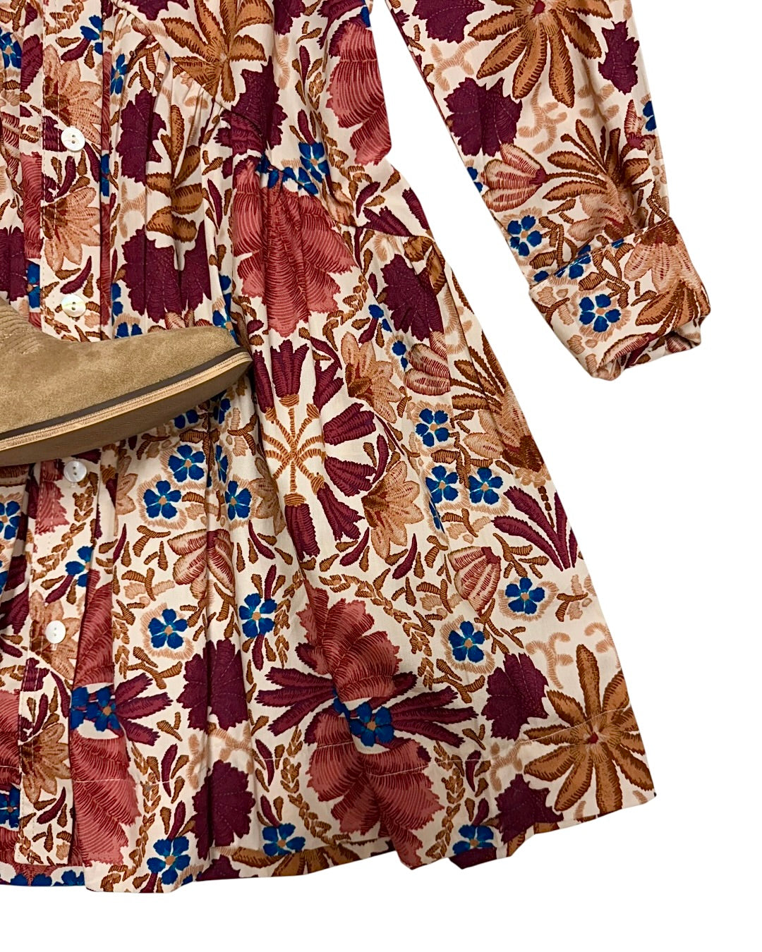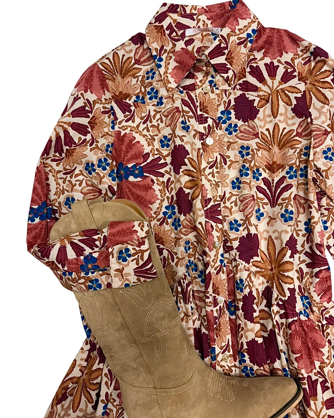 Long sleeve, floral printed, collared button down dress. Fitting slightly oversized. Size down if in between. Also available in store!