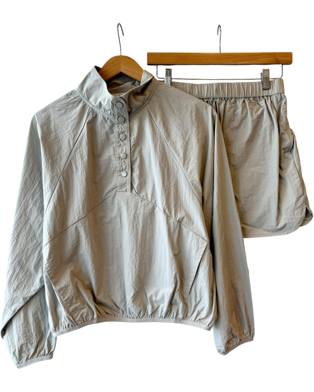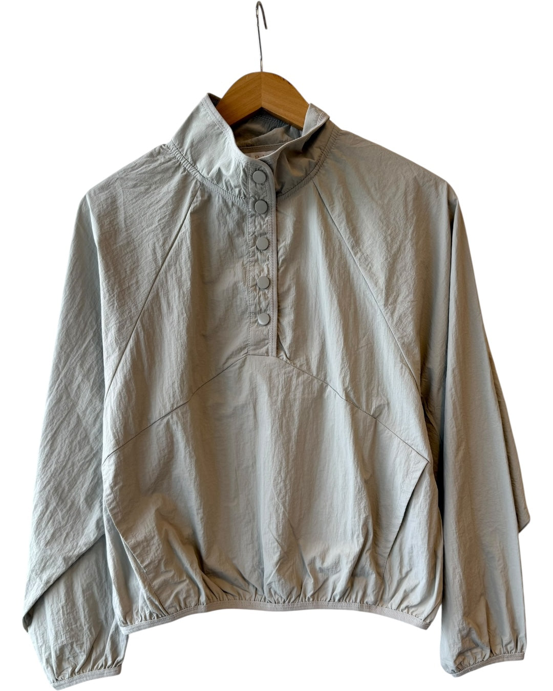 Grey windbreaker quarter button down jacket. Has two side pockets. Elastic waist banded bottom and elastic at the sleeves hem. Fitting slightly oversized. Recommended to take your true size! Also available in store!